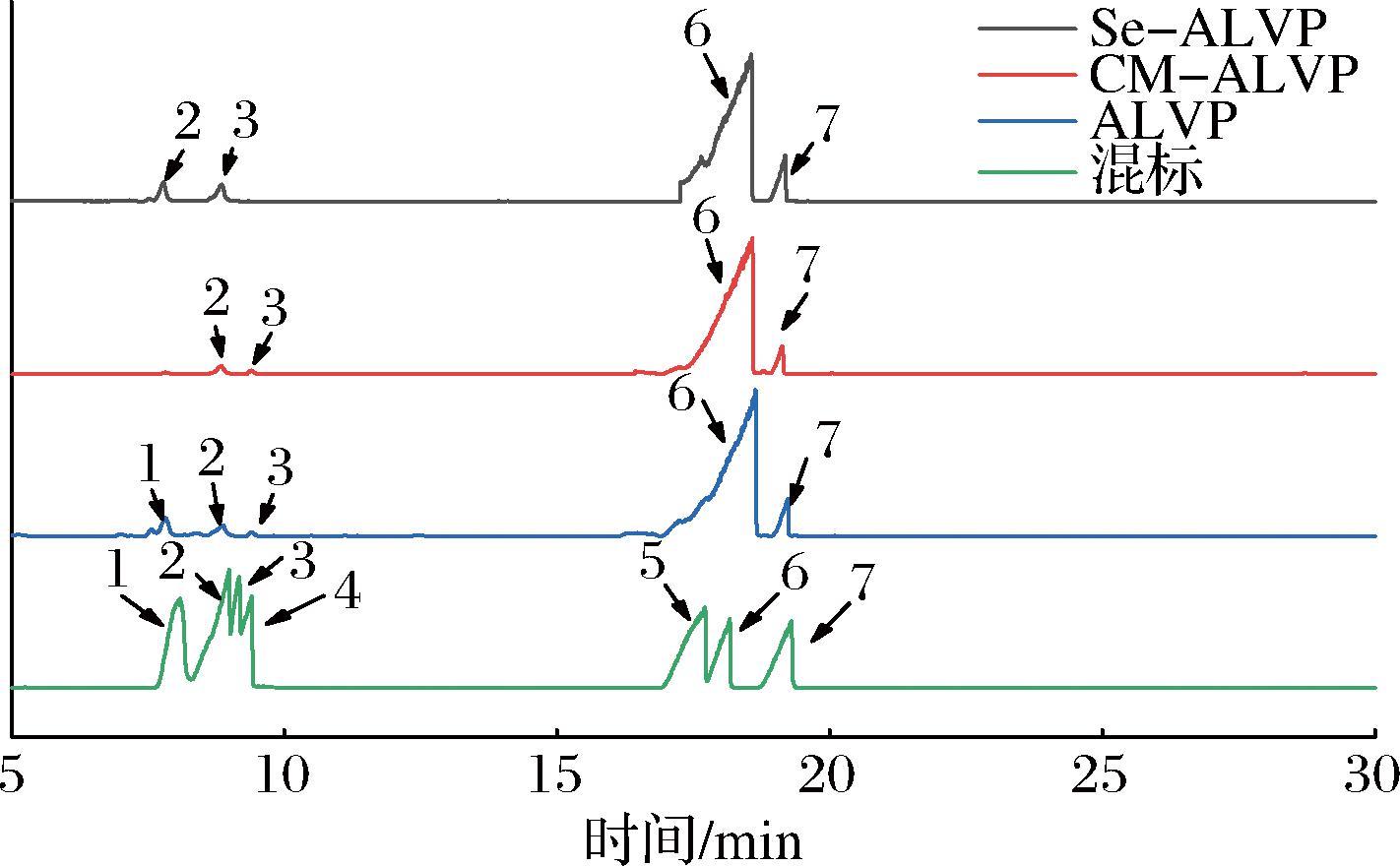 采用气相质谱检测ALVP、CM-ALVP和Se-ALVP的单糖组成。如图1所示,通过与标准品的保留时间、质谱数据对比显示,ALVP主要由岩藻糖(0.39%)、鼠李糖(4.98%)、甘露糖(1.54%)、半乳糖(80.86%)、葡萄糖(12.13%)等组成的杂多糖,修饰后的多糖CM-ALVP和Se-ALVP单糖组成没有发生变化,但单糖的组成比例发生明显变化,其中半乳糖和葡萄糖摩尔比例无明显变化,岩藻糖和甘露糖明显增加。这表明羧甲基化、硒化修饰主要发生在多糖的支链上,可能不发生在主链。这是因为与主链相比,支链上的修饰点位更多,且更容易受到外界基团的攻击,导致其—OH、—NH4、—CHO等更容易被取代[33]。
