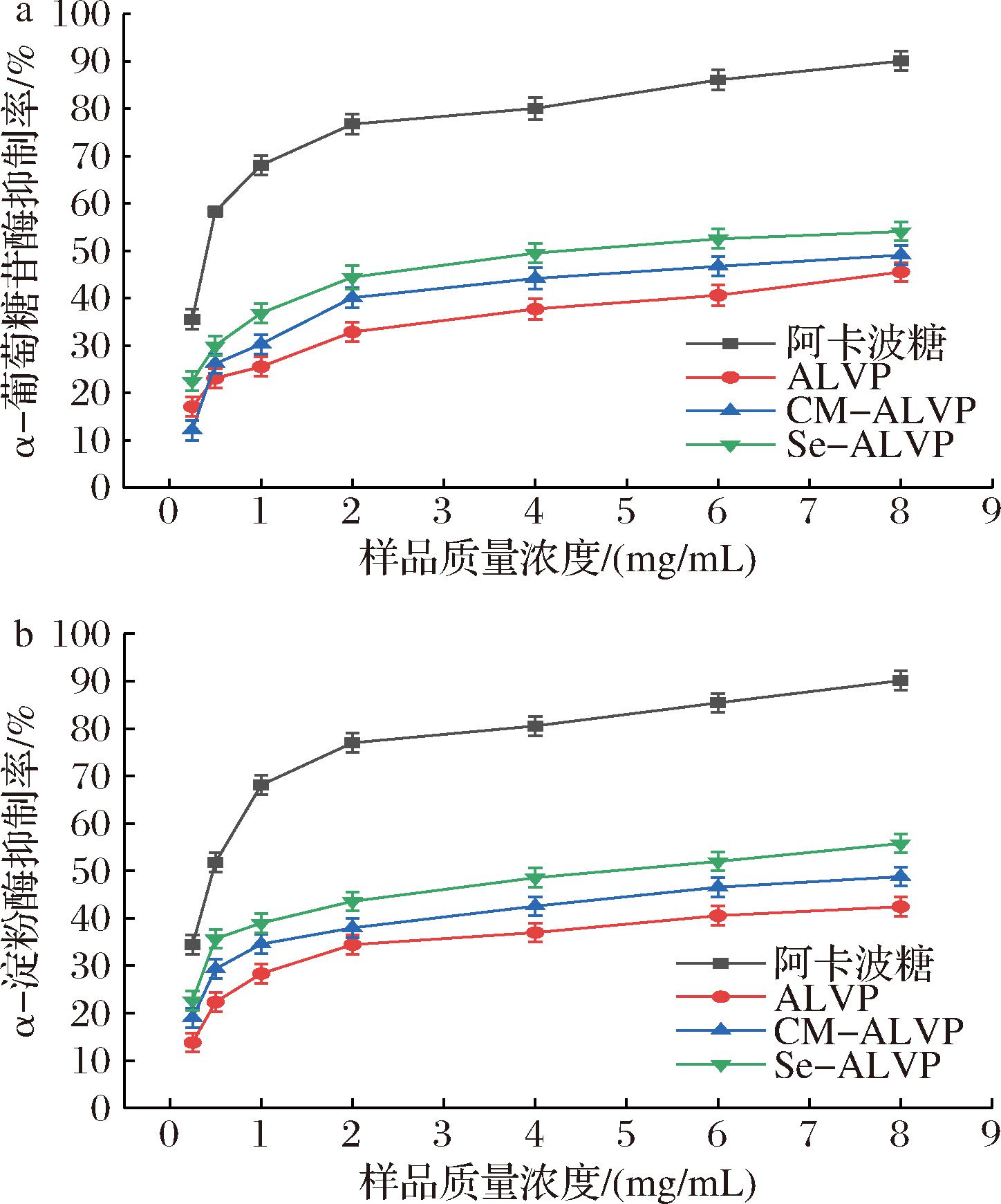 分别参考冯学珍等[28]、LYU等[29]的方法,以阿卡波糖为阳性对照,测定不同质量浓度(0.25、0.5、1、2、4、6、8 mg/mL)的ALVP、CM-ALVP和Se-ALVP对α-葡萄糖苷酶和α-淀粉酶的抑制作用。