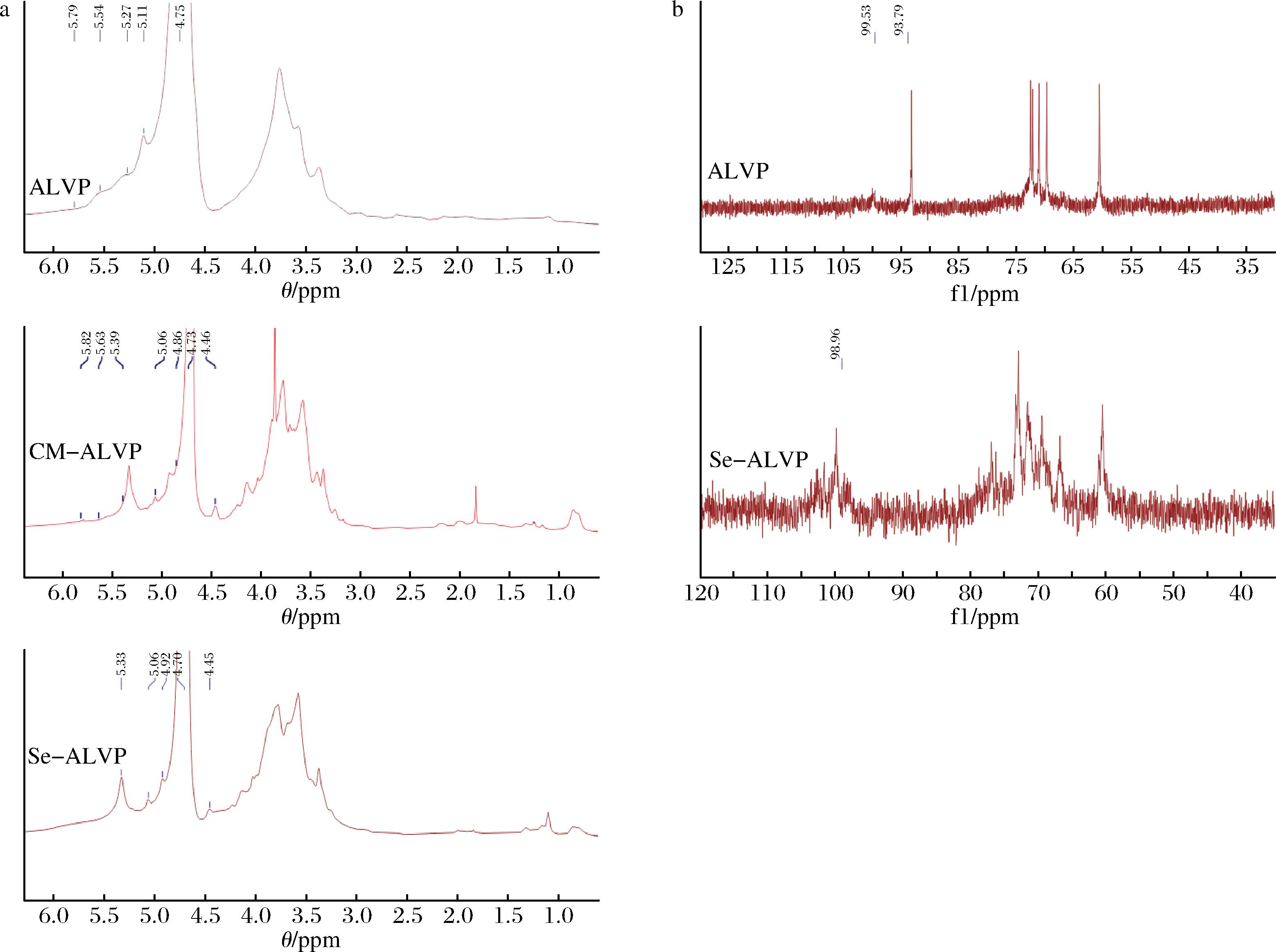 由图6-a可知,ALVP、CM-ALVP和Se-ALVP的1H NMR谱图可以看出,1H信号分布在3.0~4.3 ppm和4.3~6 ppm。δ 4.75 ppm为D2O的氢质子信号,在δ 4.75~5.79 ppm范围内出现的信号峰是多糖的特征峰。异头氢的信号区域在4.46~5.82 ppm,异头氢化学位移大于4.95 ppm是α构型的糖苷键,小于4.95 ppm是β构型的糖苷键[45],说明在ALVP中含有α构型糖苷键,CM-ALVP和Se-ALVP可能同时具有α构型糖苷键和β构型糖苷键。与ALVP相比,CM-ALVP和Se-ALVP在δ 4.46 ppm和δ 4.45 ppm处出现的信号峰是—OH上的氢被羧甲基(—OCH2COO)和硒基取代所致。