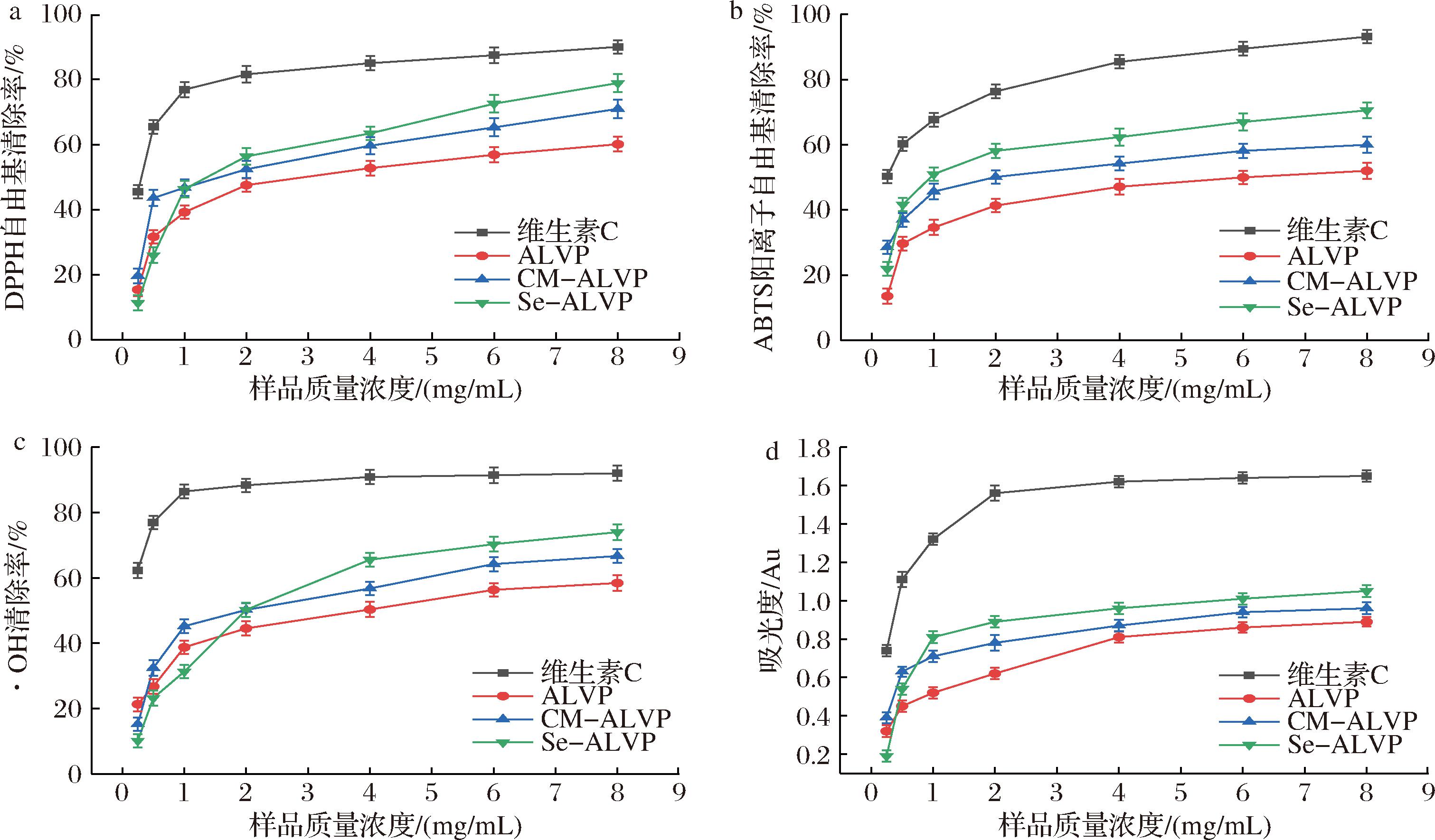 植物多糖作为天然生物活性物质,正逐渐成为抗氧化研究的焦点。研究显示,植物多糖不仅能有效清除自由基,还可提升细胞中抗氧化酶的活性,从而增强机体的防御功能。在评估多糖的抗氧化活性时,清除率、半抑制浓度(IC50)等指标尤为重要。清除率反映多糖中和自由基的能力,较高的清除率意味着有效减少细胞氧化应激对细胞的损害。IC50是评估多糖抗氧化效力的关键,较低的IC50值表明在低浓度下,多糖也能表现出显著的抗氧化效果,用来评估其作为天然抗氧化剂的潜力。如图7所示,在实验研究范围内,ALVP、CM-ALVP和Se-ALVP对DPPH自由基、ABTS阳离子自由基、·OH清除率及Fe3+还原力均呈现一定的剂量依赖关系,当质量浓度为8 mg/mL时,ALVP、CM-ALVP和Se-ALVP对DPPH、ABTS阳离子、·OH的清除能力及Fe3+还原力达到最大,对DPPH自由基清除率分别为60.1%、70.98%和78.91%,IC50值分别为3.05、1.76、1.35 mg/mL,对ABTS阳离子自由基清除率分别为52.01%、60.02%和70.55%,IC50值分别为5.72、1.79、0.96 mg/mL,对·OH清除率分别为58.44%、66.7%、74.10%,IC50值分别为4.00、2.00、2.00 mg/mL,对Fe3+的还原力分别为0.89、0.96、1.05 AU,结果表明羧甲基化、硒化修饰能明显增强ALVP的抗氧化活性,这可能是因为羧甲基化修饰可以增强多糖的电负性、改变其空间结构从而提高自由基清除能力,而硒化修饰降低了多糖的氢键解离能,提高了供氢能力[47]。