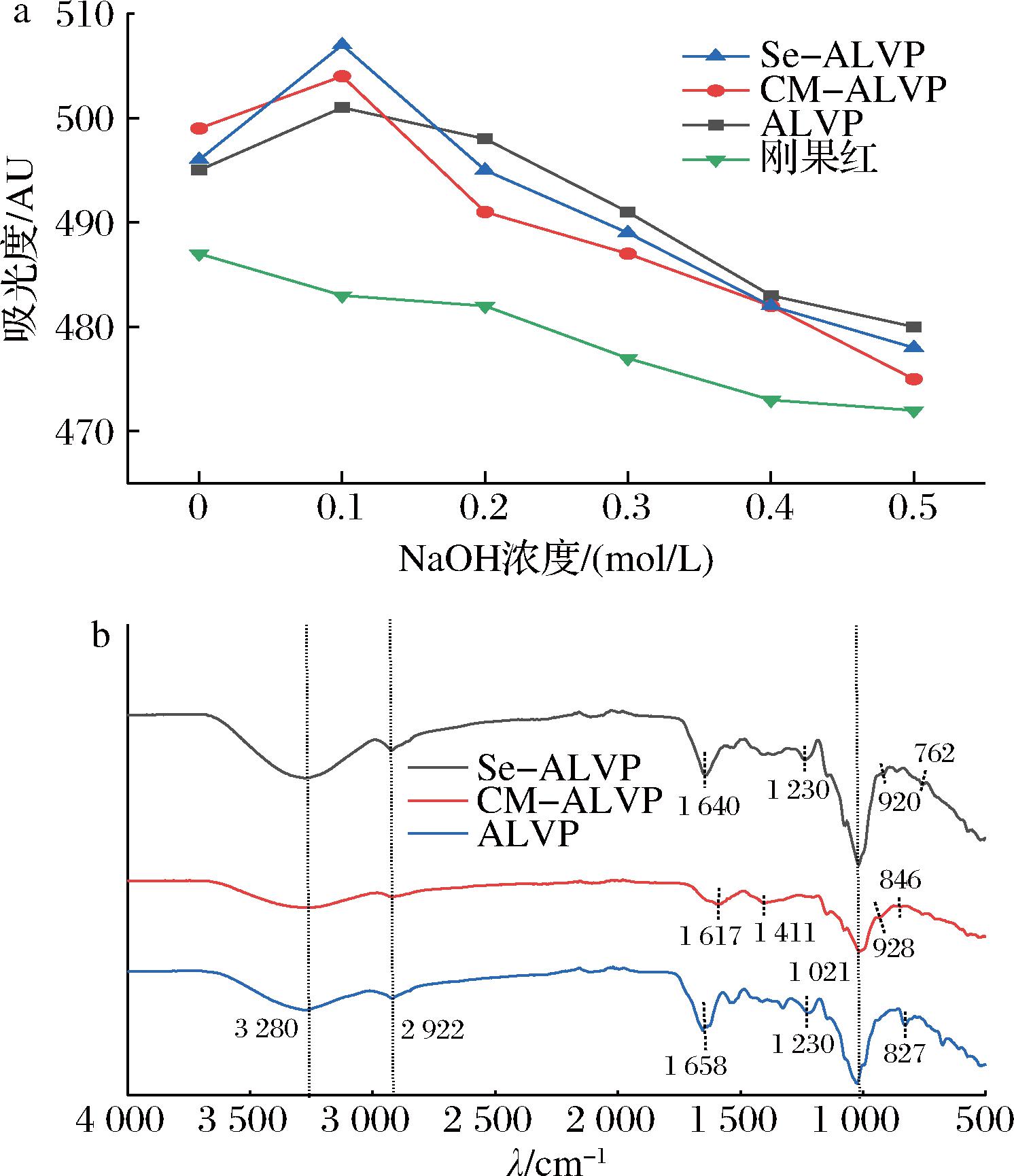 图5 ALVP、CM-ALVP、Se-ALVP在不同浓度NaOH溶液中的λmax和ALVP、CM-ALVP和Se-ALVP的IR谱图