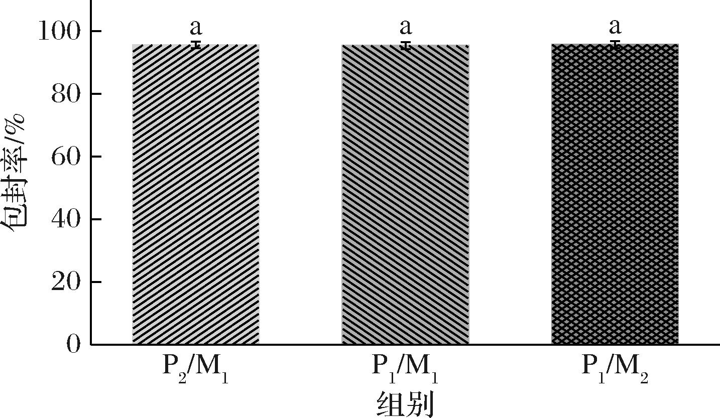 为研究脂质相变化对辅酶Q10-NLCs的负载能力的影响,对辅酶Q10包封效果进行测定。测定结果发现(图4),所有NLCs对辅酶Q10的包封率在95%以上,均表现出良好的负载能力,且NLCs的封装能力没有随脂质相的改变发生显著性变化,这得益于自身载体中晶体结构形成的纳米室,增加了负载空间[9],以及辅酶Q10的脂溶性使其与脂质相之间表现出高亲和力,减少了排斥作用。另外,大多数亲脂性药物在液态油中的溶解性优于固体脂质。JENNING等[23]的研究中,比较SLNs和NLCs的对脂溶性药物的包封效果时,NLCs显示出比SLNs更高的载药量和包封效率。