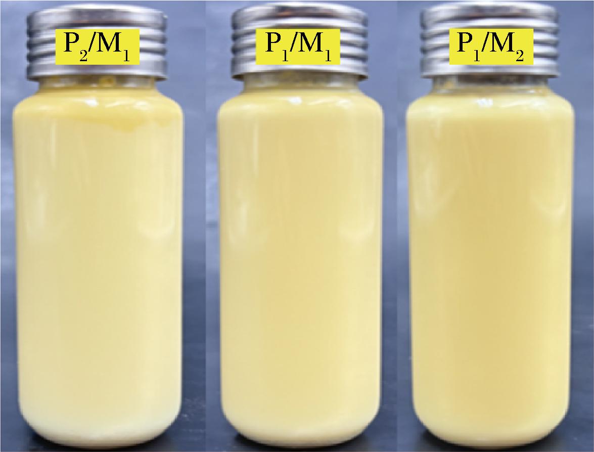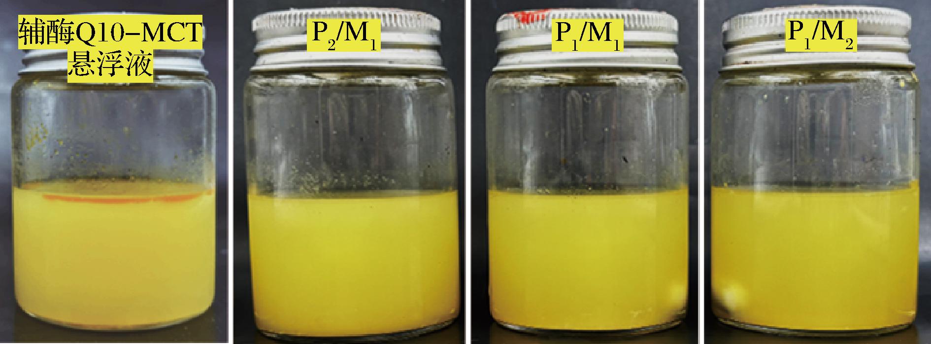 通过将辅酶Q10-NLCs常温放置28 d后,测定粒径、PDI以及zeta电位来评估其储藏稳定性。如图5所示,储藏28 d后,P2/M1和P1/M2在外观上出现不同程度的颗粒聚集,且随着脂质相中固态脂质比例的上升,程度加深;经测定发现(表1),储藏后的平均粒径发生显著上升(P<0.05),而PDI略有上升,zeta电位绝对值略有下降,这些数值均发生不稳定的趋势变化。与之相反,P1/M2对应的脂质载体颗粒在外观及3种测定参数均表现出良好的物理稳定性。基于已有的研究发现[19],脂质相中固体脂质的比例较高,晶体数量越多,在储藏过程中易发生老化现象,导致严重的物理性质不稳定。