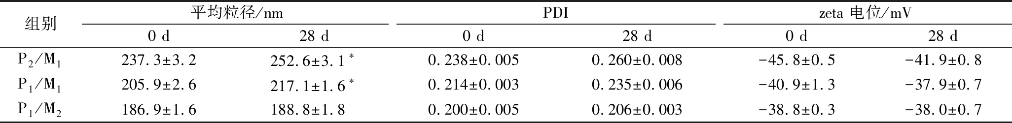 组别平均粒径/nmPDIzeta 电位/mV0 d28 d0 d28 d0 d28 dP2/M1237.3±3.2252.6±3.1∗0.238±0.0050.260±0.008-45.8±0.5-41.9±0.8P1/M1205.9±2.6217.1±1.6∗0.214±0.0030.235±0.006-40.9±1.3-37.9±0.7P1/M2186.9±1.6188.8±1.80.200±0.0050.206±0.003-38.8±0.3-38.0±0.7