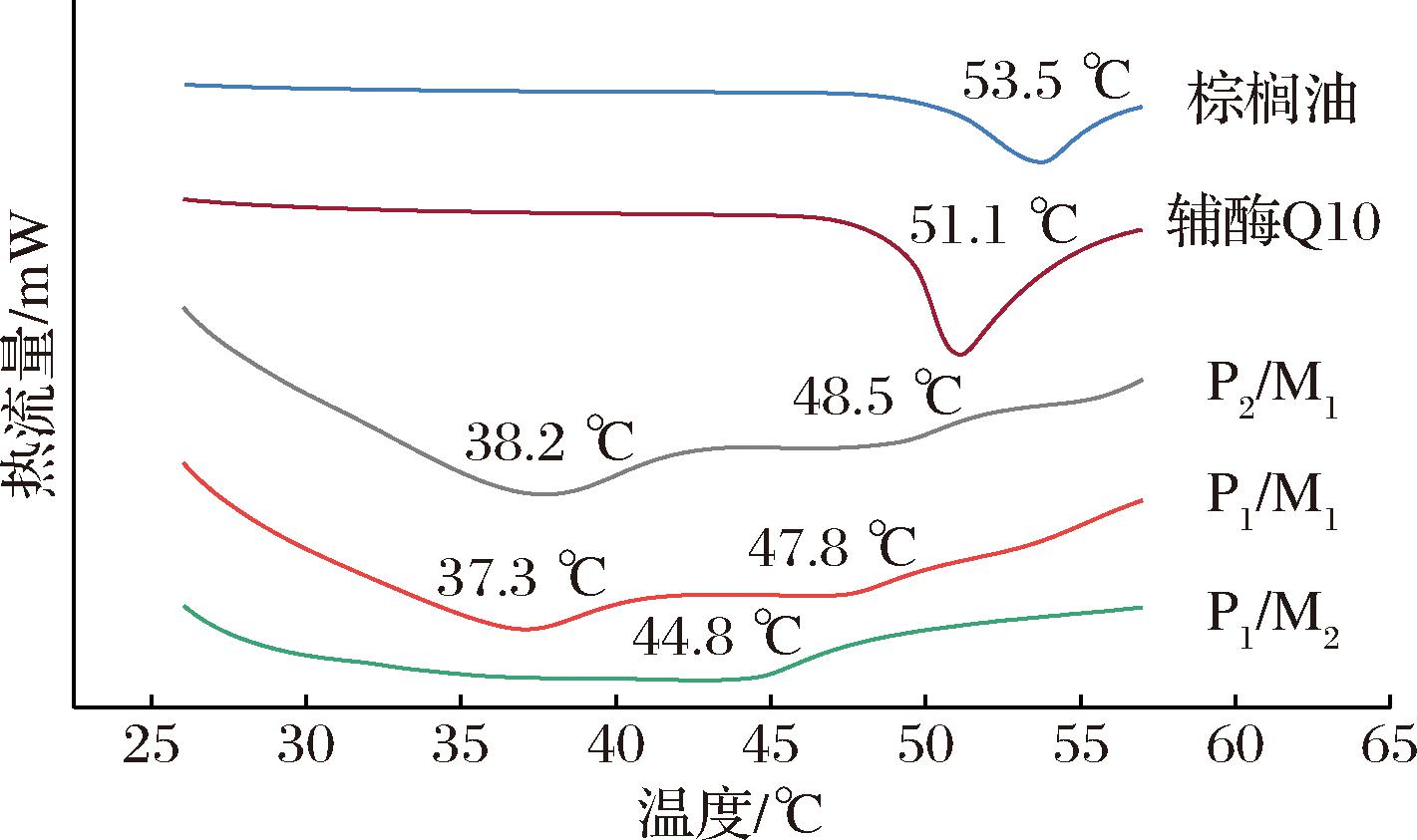 为了表征辅酶Q10-NLCs的多态性和结晶度,对棕榈油、辅酶Q10原料以及几种NLCs进行了DSC分析。如图3所示,棕榈油和辅酶Q10的DSC曲线分别在53.5 ℃和51.1 ℃时出现明显的吸热峰,即这两个温度分别对应为各自的熔点。与原材料相比,NLCs中棕榈油和辅酶Q10的熔化温度均明显低于其熔点,这主要是由于包埋后晶体尺寸从微米级转变为纳米级,尺寸的减小和比表面积的增加导致熔化温度降低[20]。另外,MCT的掺入使棕榈油和辅酶Q10易形成熔点较低的亚稳态晶型[21],以及随着MCT的增加导致脂质载体颗粒尺寸的降低,进而造成两种晶体熔化温度呈现下降的趋势。在P2/M1和P1/M1中,辅酶Q10的熔化温度发生了显著性的下降,变化超过10 ℃,根据对其结构的研究[10],这可能是棕榈油晶体形成的纳米室,使辅酶Q10晶体进一步减小;然而,P1/M2中辅酶Q10未发生明显的吸热峰,这说明辅酶Q10溶解在脂质相中,可能是MCT比例的进一步增加,使冷却至室温后辅酶Q10处于过冷熔融态、无定形或分子分散状态[22]。