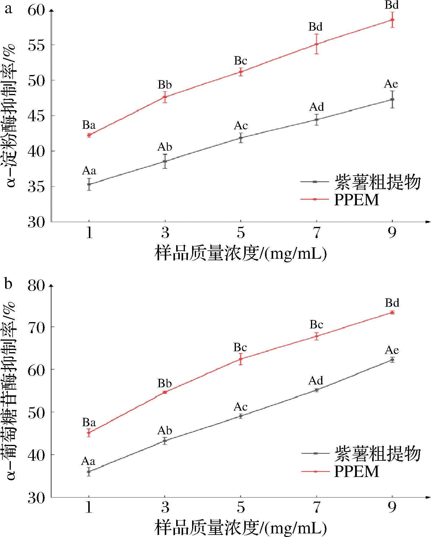 2.7.1 PPEM和粗提物对α-淀粉酶、α-葡萄糖苷酶的抑制结果