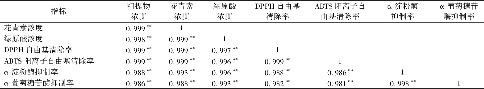 指标粗提物浓度花青素浓度绿原酸浓度DPPH自由基清除率ABTS阳离子自由基清除率α-淀粉酶抑制率α-葡萄糖苷酶抑制率花青素浓度0.999∗∗1绿原酸浓度0.998∗∗0.999∗∗1DPPH自由基清除率0.999∗∗0.999∗∗0.997∗∗1ABTS阳离子自由基清除率0.999∗∗0.999∗∗0.996∗∗0.999∗∗1α-淀粉酶抑制率0.988∗∗0.993∗∗0.996∗∗0.988∗∗0.986∗∗1α-葡萄糖苷酶抑制率0.986∗∗0.988∗∗0.993∗∗0.982∗∗0.981∗∗0.998∗∗1