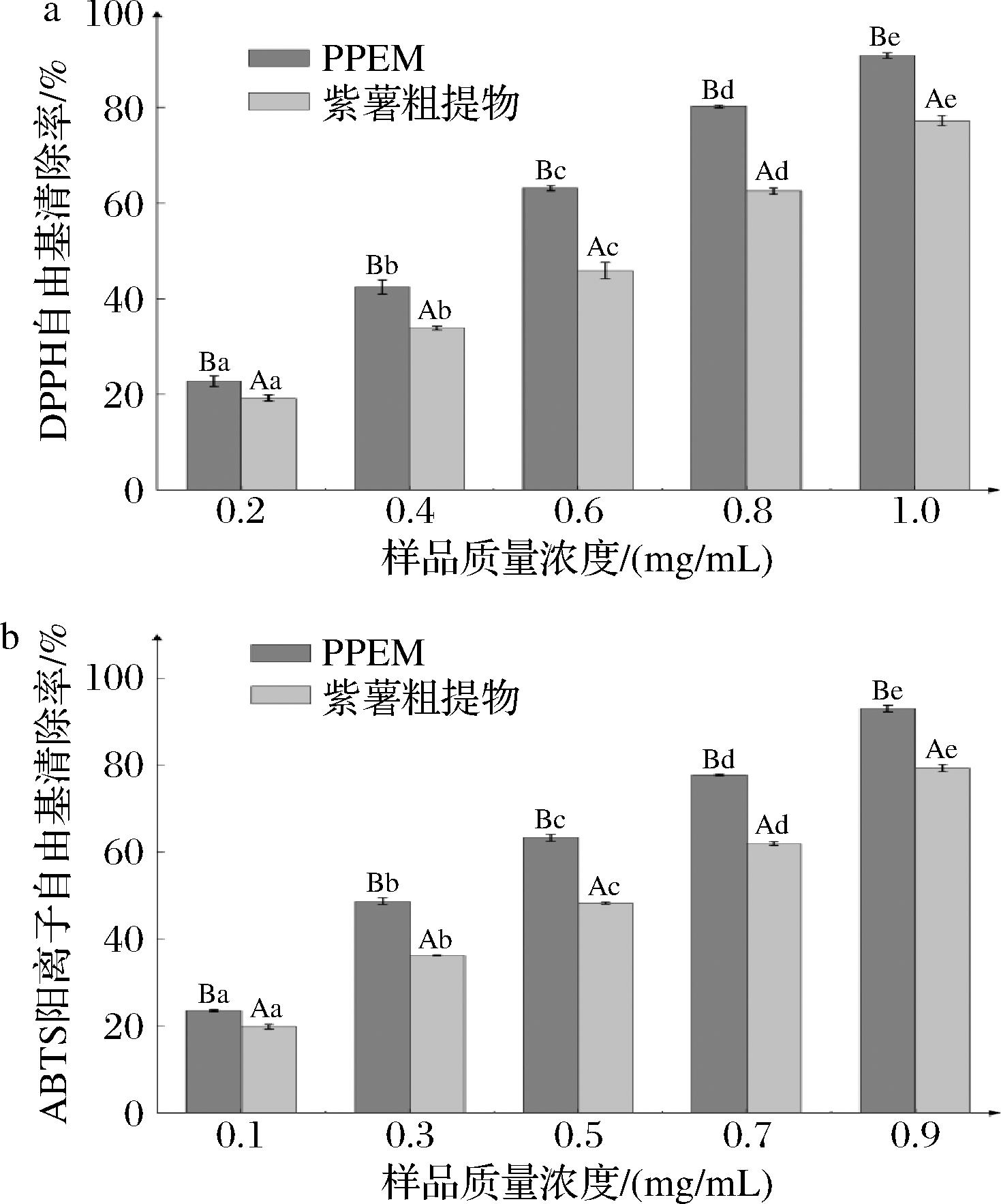 DPPH自由基和ABTS阳离子自由基的清除率是评价抗氧化能力的重要指标,IC50值越小证明抗氧化性能力越强[56]。未包埋的粗提物和PPEM对2种自由基清除率如图5所示,经计算,粗提物和PPEM清除DPPH自由基IC50分别为0.63、0.48 mg/mL,清除ABTS阳离子自由基IC50分别为0.51、0.36 mg/mL。