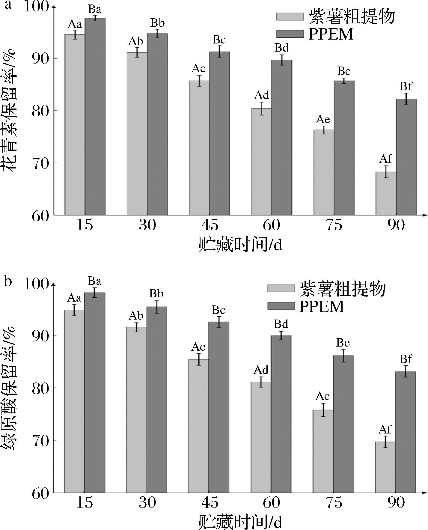 参考卢钏燚等[25]的方法并稍作修改,分别称取0.1 g紫薯粗提物、PPEM(每种样品共6袋)装入铝箔自封袋,室温避光条件下储存90 d,每隔15 d取出1袋,2种样品的花青素和绿原酸的保留率按照公式(7)、公式(8)分别计算,其中,花青素和绿原酸质量的计算见公式(4)和公式(5)。