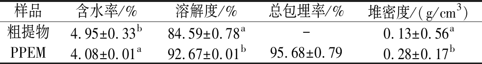 样品含水率/%溶解度/%总包埋率/%堆密度/(g/cm3)粗提物4.95±0.33b84.59±0.78a-0.13±0.56aPPEM4.08±0.01a92.67±0.01b95.68±0.790.28±0.17b