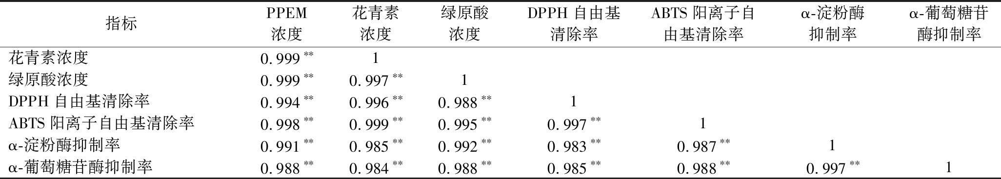 表2、表3显示不同浓度的PPEM和粗提物与DPPH自由基和ABTS阳离子自由基的清除率及α-淀粉酶、α-葡萄糖苷酶抑制率之间均具有极显著正相关性(P<0.01),花青素和绿原酸浓度与各活性指标间也具有极显著正相关性(P<0.01),提示紫薯粗提物或PPEM所体现的抗氧化活性及体外降糖活性均与其中的花青素和绿原酸密切相关,进一步证实了紫薯花青素和绿原酸的相关活性功效。
