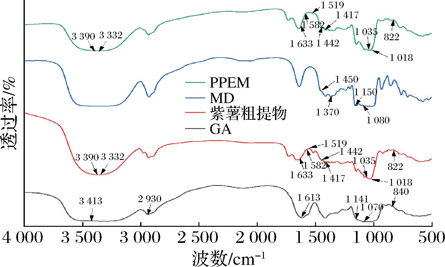 C伸展,属于花青素的特征吸收峰[43],1 035 cm-1处对应C—O键的伸缩振动。在1 582 cm-1波长处也有类似的峰,属于绿原酸等组分的对称和不对称伸缩振动[44]。3 390 cm-1宽吸收峰对应着绿原酸中的N—H的伸缩振动,1 417、1 018 cm-1为绿原酸中的芳环骨架振动吸收峰,而822 cm-1为C—H振动吸收峰[45]。当包埋物形成后,芯材和壁材之间的非共价键,如疏水作用、范德华力和氢键等会减弱,相应基团的吸收强度也会降低[46]。GA与芯材形成微胶囊后GA的酰胺I带出现了偏移,说明GA与芯材存在相互作用,同时相比于GA和MD的1 500~1 600 cm-1,PPEM也出现了相应的偏移,说明壁材和花青素之间存在氢键相互作用[47]。通过比较发现PPEM与紫薯粗提物的图谱基本相同,但在1 519 cm-1和3 390 cm-1处花青素和绿原酸的特征峰强度减弱,并没有出现新的吸收峰,说明紫薯粗提物的吸收峰大多被壁材的碳骨架掩盖,花青素和绿原酸被良好地包埋在MD和GA形成的薄膜中,包埋成功。这与陈程莉等[38]的研究结果相似。