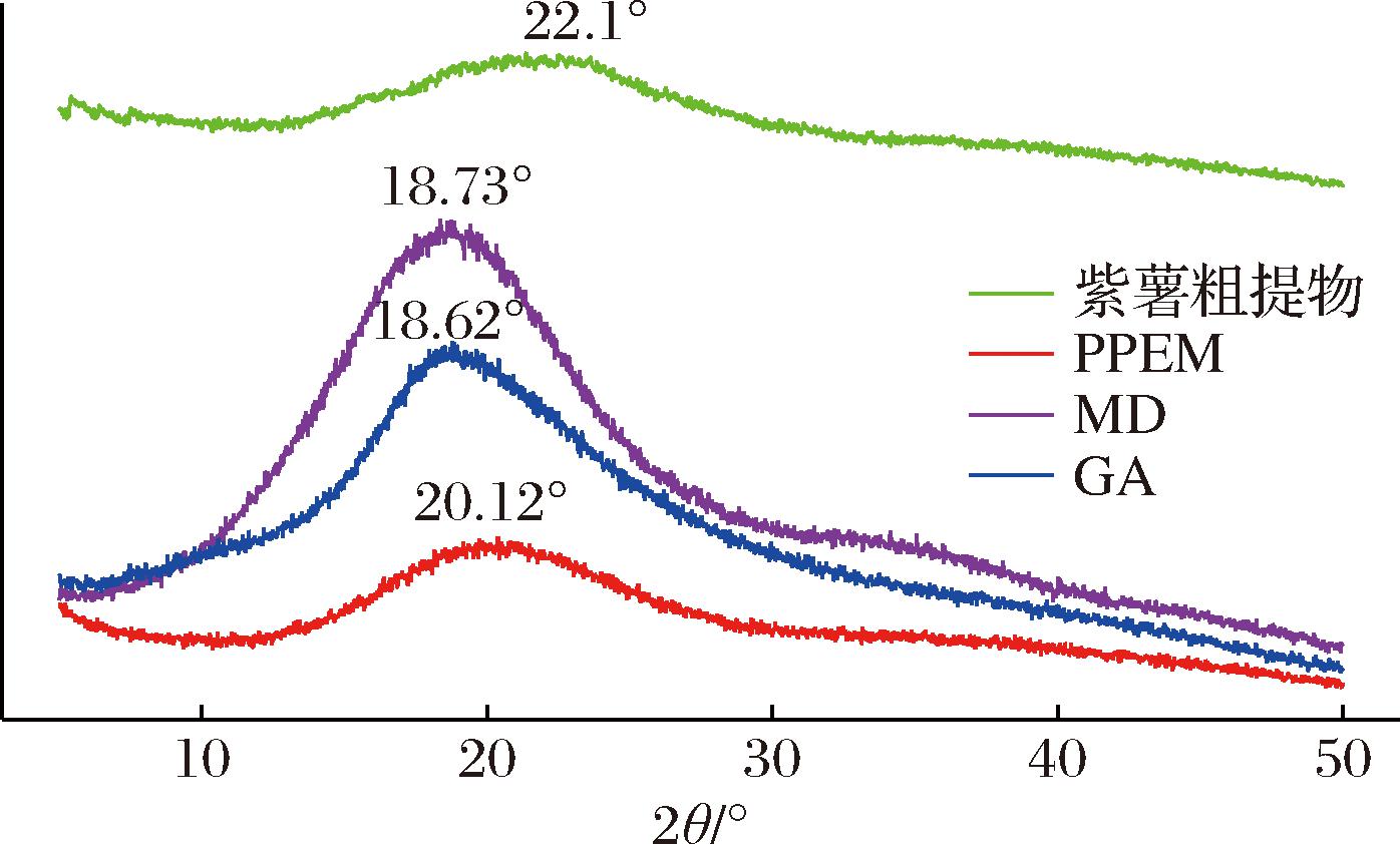 通过XRD图谱分析微胶囊是否具有结晶或无定形结构,可用于判断微胶囊的稳定性[48]。一般来说,晶型结构比无定形结构具有更高的贮藏稳定性[49]。由图3可得,PPEM衍射角(2θ)为20.12°与壁材(18.62°~18.73°)和紫薯粗提物(22.1°)相比特征峰都发生了偏移,表明花青素和绿原酸与壁材成功络合。紫薯粗提物的衍射图形为宽而矮的峰,表明紫薯粗提物存在较多无定形的结构特征。这与代佳琳[50]发现的紫玉米穗轴花色苷的XRD图相同。壁材组表现出较尖锐的衍生峰,说明MD和GA表现为晶态,因其良好的有序状态会产生尖锐且明确的峰[51]。PPEM的衍射图形为一个较宽而高的漫反射峰,表明PPEM中无定型结构较粗提物减少,结晶度增加。同样采用真空冷冻干燥法,TAO等[52]证实蓝莓花色苷被MD和乳清蛋白包埋形成微胶囊粉末也有类似情况。随着紫薯粗提物的添加,PPEM衍生峰宽度介于2种壁材与粗提物之间,表明芯材与壁材发生了相互作用,破坏了MD和GA聚合物分子的紧密堆积,从而引起规则晶体的改变[48]。虽然PPEM与粗提物均含有无定形结构,但PPEM的衍射峰较粗提物的衍射峰更加尖锐,说明PPEM结晶程度大于粗提物,进一步证实了包埋之后活性成分稳定性增强。