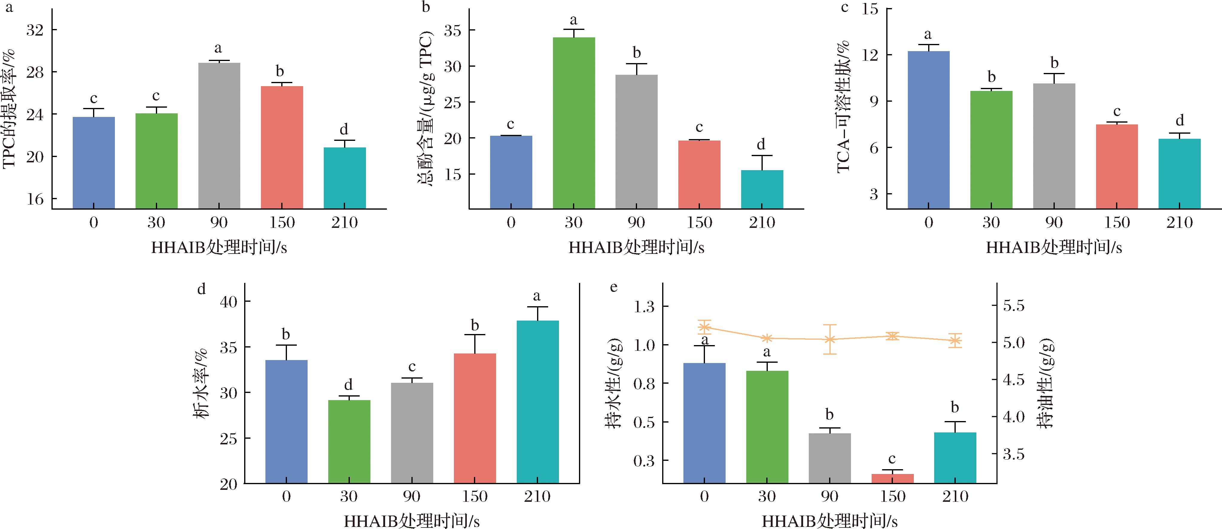 a-HHAIB处理时间对TPC提取率的影响;b-HHAIB处理时间对TPC总酚含量的影响;c-HHAIB处理时间对5% TCA可溶性肽含量影响;d-HHAIB处理时间对TPC析水率的影响;e-HHAIB处理时间对TPC持水/油性影响