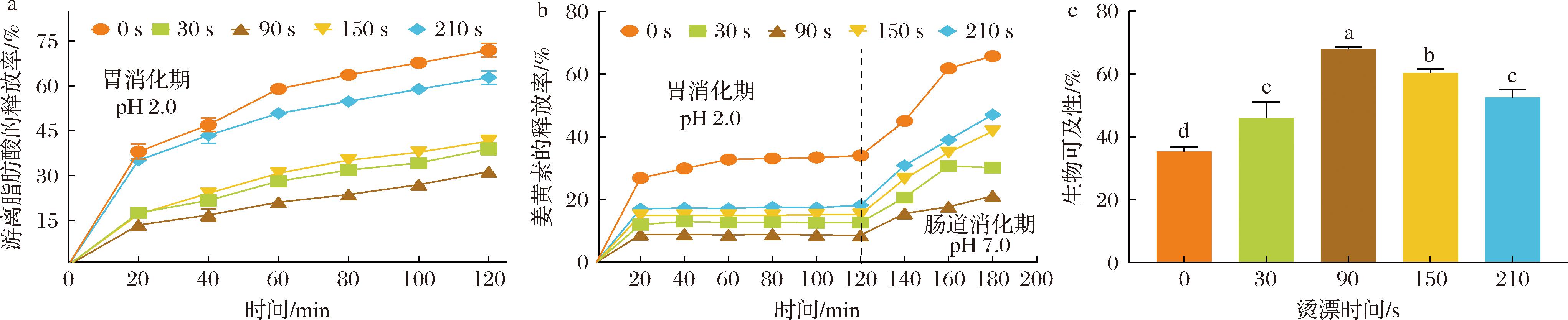 a-HHAIB处理时间对游离脂肪酸的释放速率的影响;b-HHAIB处理时间对姜黄素的释放速率的影响;c-HHAIB处理时间对姜黄素生物可及性的影响