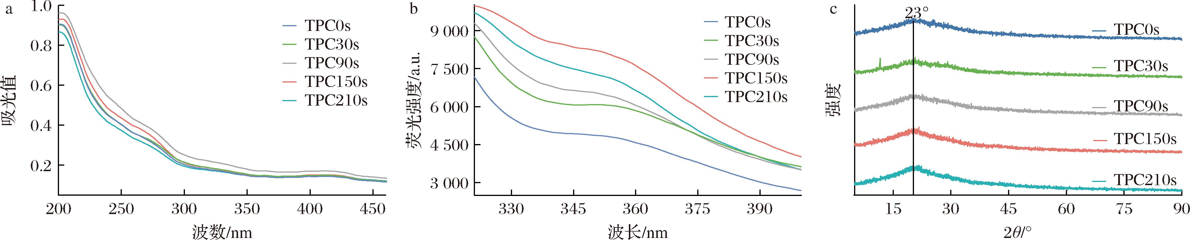 图5-a显示不同HHAIB处理时间下TPC的紫外-可见吸收光谱变化。275 nm和420 nm处的特征吸收峰分别反映不同结构特性。275 nm峰(源于芳香族氨基酸及多酚苯环结构)强度呈现先升后降趋势(30~90 s增强,150~210 s减弱),表明适度HHAIB处理可促进蛋白-多酚相互作用,而过度处理导致复合物解离[22]。图5-b显示TPC的内源荧光光谱变化,所有样品在345~375 nm处均出现色氨酸残基特征发射峰。150 s处理组荧光强度最高,210 s处理组次之,未处理组(0 s)最低。这种变化说明适度HHAIB处理通过改变色氨酸微环境极性和调控蛋白-多酚相互作用诱导蛋白质构象变化[23]。150 s处理组的荧光增强效应与FTIR检测的二级结构转变(表2)具有相关性,证实最优处理条件下可产生协同结构修饰。图5-c显示了HHAIB处理下TPC的X射线衍射图谱,2θ≈20°处的宽泛弥散峰证实其无定形结构特征。