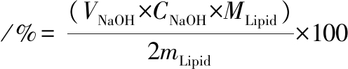式中:CNaOH、VNaOH、MLipid和mLipid分别代表NaOH的摩尔浓度(mol/L)、消耗的NaOH溶液的体积(L)、油的摩尔质量(g/mol)和样品中油的质量(g)。