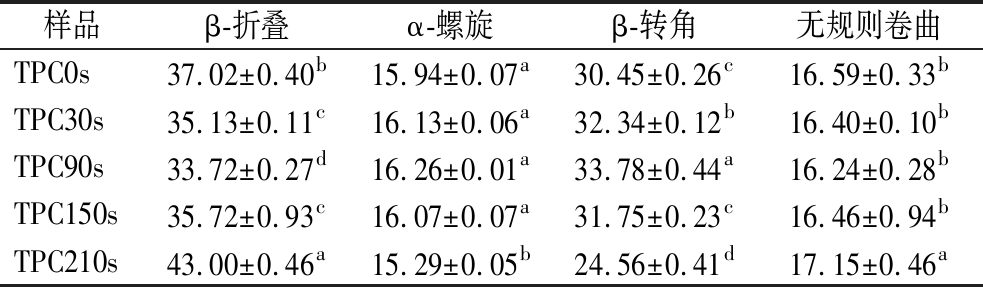 样品β-折叠α-螺旋β-转角无规则卷曲TPC0s37.02±0.40b15.94±0.07a30.45±0.26c16.59±0.33bTPC30s35.13±0.11c16.13±0.06a32.34±0.12b16.40±0.10bTPC90s33.72±0.27d16.26±0.01a33.78±0.44a16.24±0.28bTPC150s35.72±0.93c16.07±0.07a31.75±0.23c16.46±0.94bTPC210s43.00±0.46a15.29±0.05b24.56±0.41d17.15±0.46a