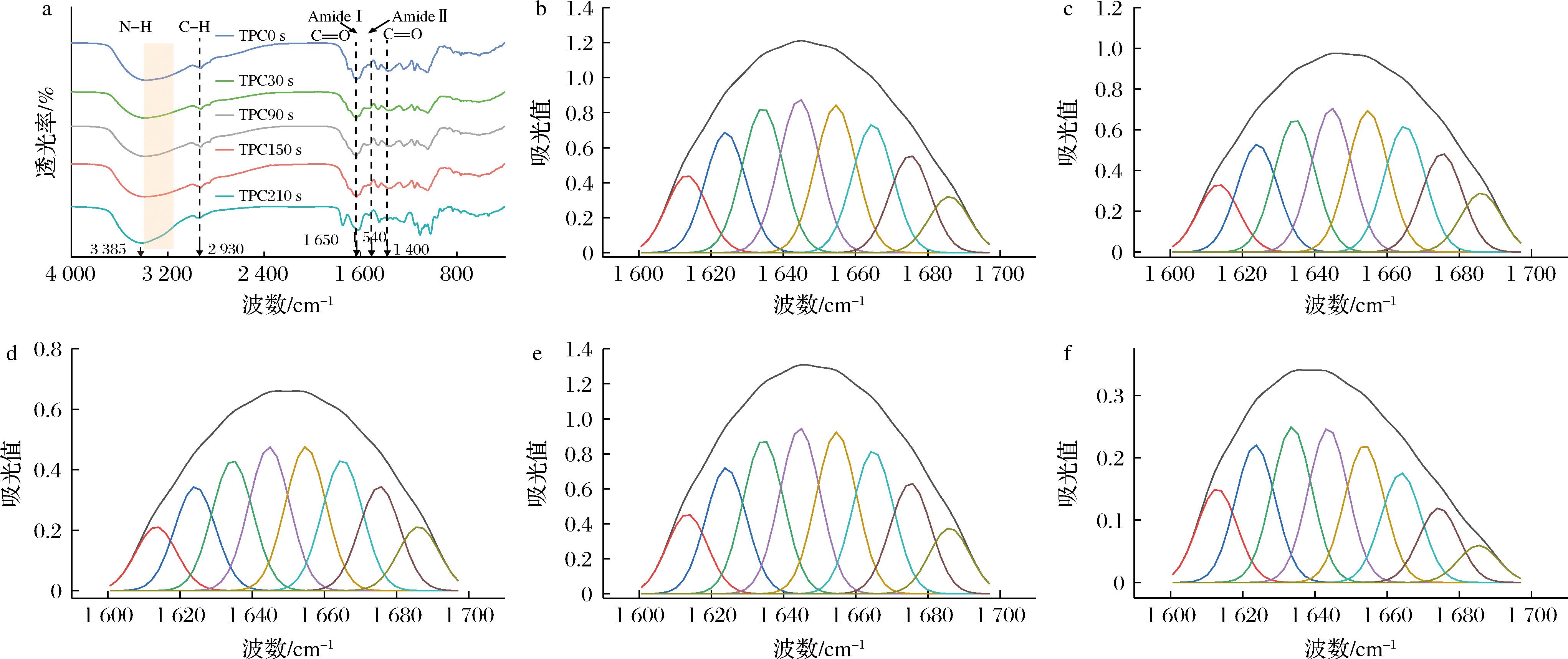 a-HHAIB处理时间对TPC红外光谱的影响;b、c、d、e、f-TPC0s、TPC30s、TPC90s、TPC150s、TPC210s的红外去卷积光谱