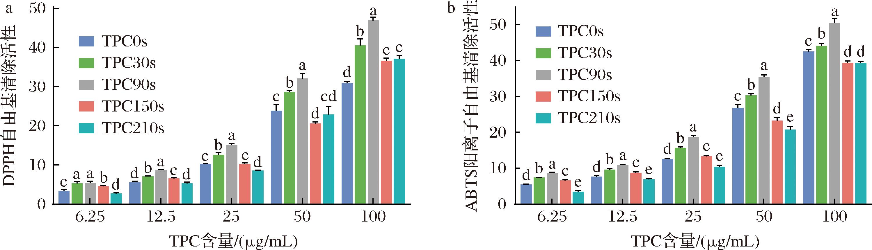 如图6-a所示,不同HHAIB处理时间的TPC对DPPH自由基的清除能力呈现浓度依赖性。在50 μg/mL浓度下,TPC0s、TPC30s、TPC90s、TPC150s和TPC210s的清除率分别为(23.85±1.59)%、(28.58±0.43)%、(32.07±1.27)%、(20.57±0.44)%和(22.85±2.16)%。其中,TPC90s表现出最优异的清除能力,这与其增强的多酚结合能力直接相关。短时处理(≤90 s)可提升清除活性,而长时处理(150~210 s)则显著降低(P<0.05),这可能是由于蛋白质构象变化导致多酚结合能力下降所致[24]。