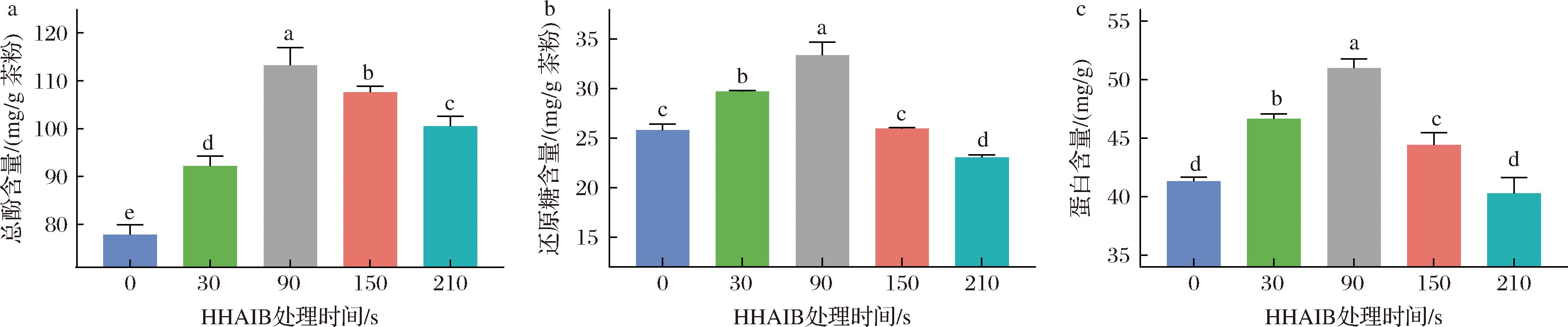 a-HHAIB处理时间对茶粉总酚含量的影响;b-HHAIB处理时间对茶粉还原糖含量的影响;c-HHAIB处理时间对茶粉蛋白质含量的影响