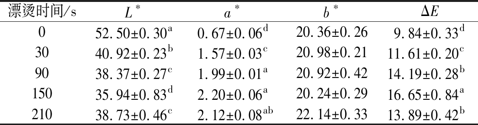 漂烫时间/sL∗a∗b∗ΔE052.50±0.30a0.67±0.06d20.36±0.269.84±0.33d3040.92±0.23b1.57±0.03c20.98±0.2111.61±0.20c9038.37±0.27c1.99±0.01a20.92±0.4214.19±0.28b15035.94±0.83d2.20±0.06a20.24±0.2916.65±0.84a21038.73±0.46c2.12±0.08ab22.14±0.3313.89±0.42b