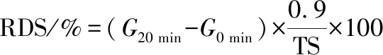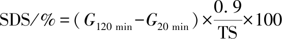 式中:G0 min,样品游离葡萄糖质量,mg;G20 min,淀粉水解20 min产生的葡萄糖质量,mg;G120 min,淀粉水解120 min产生的葡萄糖质量,mg;TS,样品中总淀粉的质量,mg。