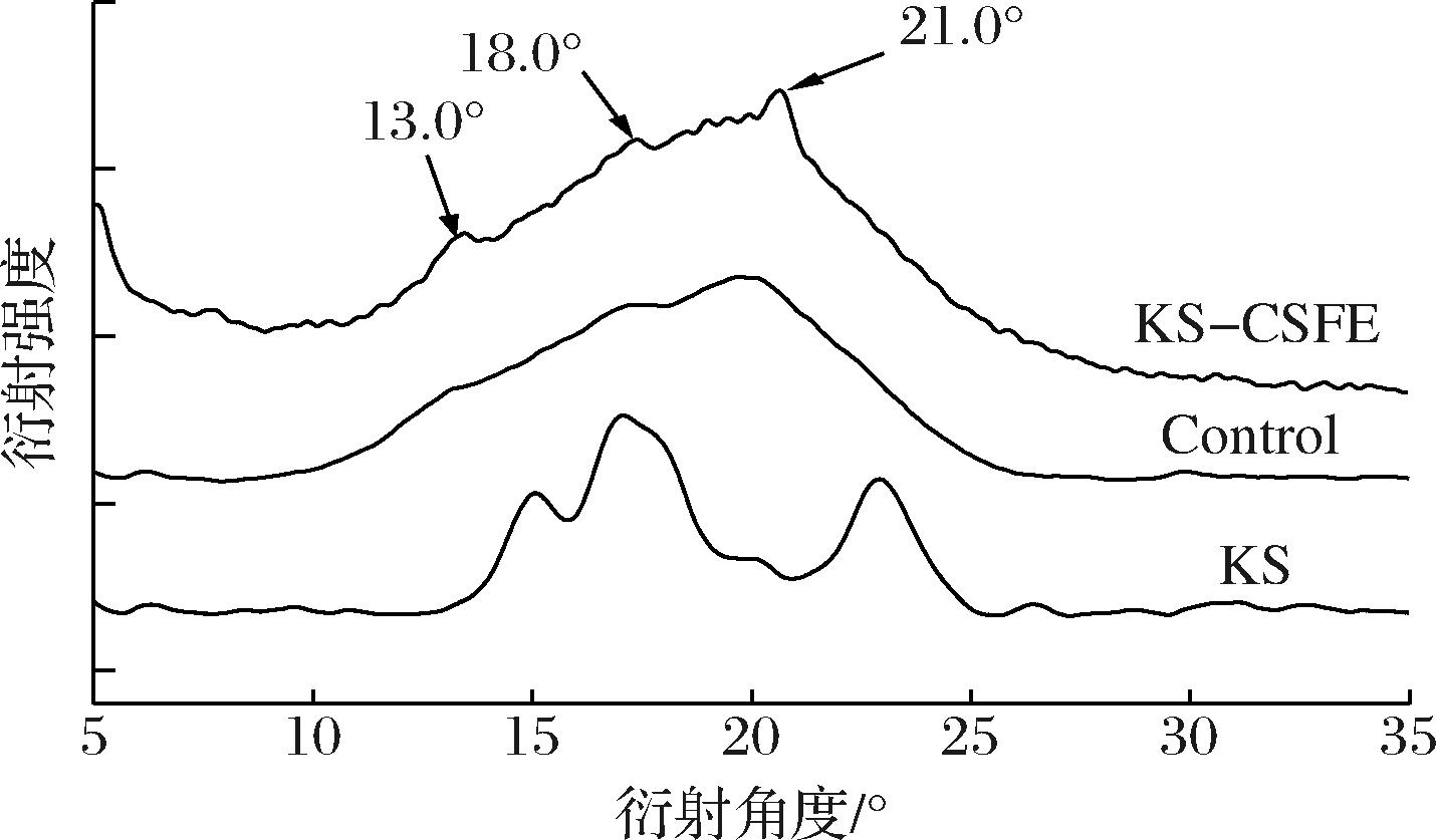 如图3所示,KS在15.0°、17.0°和23.0°处具有较明显的衍射峰,为A型晶体结构,相对结晶度为37.23%(表2)。压热处理后Control没有明显的特征峰且相对结晶度为0.08%,表明压热处理过程中破坏了KS的原有晶型结构[18]。KS-CSFE在13.0°和21.0°存在较为明显的特征峰,表现为V型复合物特征,可能是由于一部分CSFE内黄酮小分子化合物进入KS直链淀粉螺旋内的疏水空腔中以促进V型复合物。KS-CSFE在18.0°出现明显的特征峰,新峰的出现可能是由于一部分CSFE内黄酮化合物通过氢键作用结合在KS表面形成非包合复合物。研究表明CSFE与板栗淀粉复合后其淀粉晶型未发生改变[7],这可能与复合方法有关。如表2所示,KS-CSFE的结晶度相较于Control上升了12.13%。WANG等[19]将莲叶黄酮与淀粉复合后形成了新的晶体结构,LI等[20]在小麦淀粉中添加茶多酚后增加了结晶度,故可能是因为CSFE中黄酮多酚物质增加了淀粉的相对结晶度。