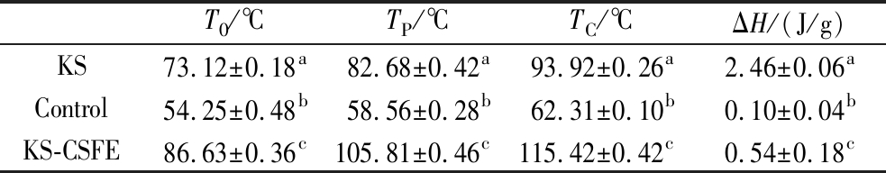 T0/℃TP/℃TC/℃ΔH/(J/g)KS73.12±0.18a82.68±0.42a93.92±0.26a2.46±0.06aControl54.25±0.48b58.56±0.28b62.31±0.10b0.10±0.04bKS-CSFE86.63±0.36c105.81±0.46c115.42±0.42c0.54±0.18c