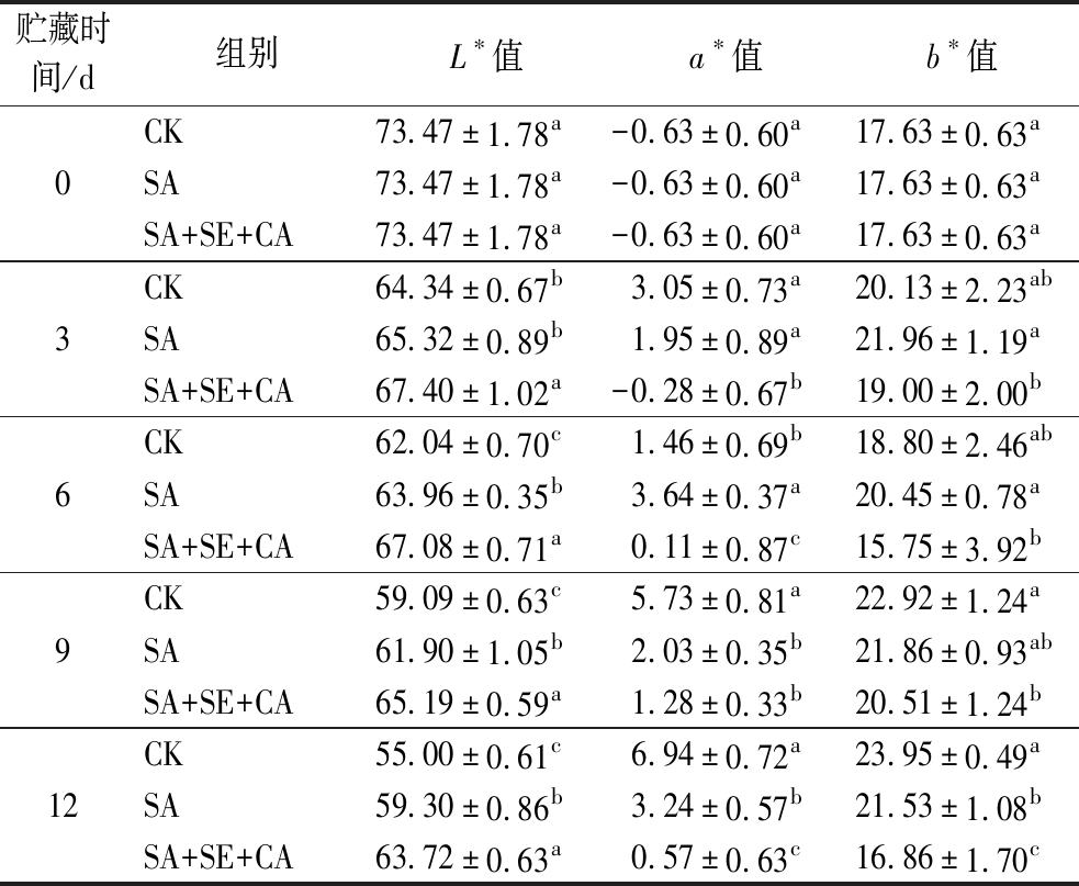 贮藏时间/d组别L∗值a∗值b∗值0CK73.47±1.78a-0.63±0.60a17.63±0.63aSA73.47±1.78a-0.63±0.60a17.63±0.63aSA+SE+CA73.47±1.78a-0.63±0.60a17.63±0.63a3CK64.34±0.67b3.05±0.73a20.13±2.23abSA65.32±0.89b1.95±0.89a21.96±1.19aSA+SE+CA67.40±1.02a-0.28±0.67b19.00±2.00b6CK62.04±0.70c1.46±0.69b18.80±2.46abSA63.96±0.35b3.64±0.37a20.45±0.78aSA+SE+CA67.08±0.71a0.11±0.87c15.75±3.92b9CK59.09±0.63c5.73±0.81a22.92±1.24aSA61.90±1.05b2.03±0.35b21.86±0.93abSA+SE+CA65.19±0.59a1.28±0.33b20.51±1.24b12CK55.00±0.61c6.94±0.72a23.95±0.49aSA59.30±0.86b3.24±0.57b21.53±1.08bSA+SE+CA63.72±0.63a0.57±0.63c16.86±1.70c
