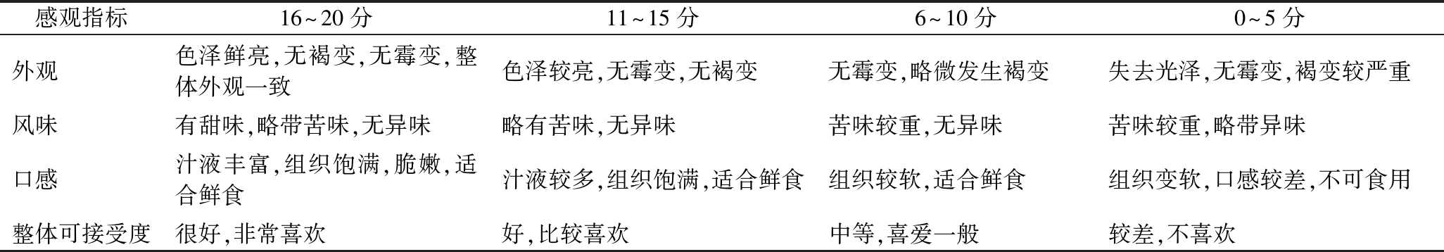 感观指标16~20分11~15分6~10分0~5分外观色泽鲜亮,无褐变,无霉变,整体外观一致色泽较亮,无霉变,无褐变无霉变,略微发生褐变失去光泽,无霉变,褐变较严重风味有甜味,略带苦味,无异味略有苦味,无异味苦味较重,无异味苦味较重,略带异味口感汁液丰富,组织饱满,脆嫩,适合鲜食汁液较多,组织饱满,适合鲜食组织较软,适合鲜食组织变软,口感较差,不可食用整体可接受度很好,非常喜欢好,比较喜欢中等,喜爱一般较差,不喜欢