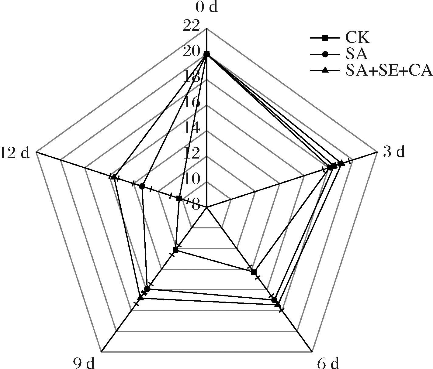 将提前挑选好的新鲜肉苁蓉削皮清洗后,切分为厚度1 cm左右,直径4~6 cm的圆片,分别放入对照组(蒸馏水:CK)、海藻酸钠组(0.7%海藻酸钠,质量分数:SA)、海藻酸钠复合涂膜组(0.7%海藻酸钠+0.47%异抗坏血酸钠+0.64%柠檬酸,均为质量分数:SA+SE+CA)溶液中浸泡10 min,之后取出自然沥干,至表面无水滴下[12,17]。然后装入真空包装袋中,在(4±1) ℃的条件贮藏12 d,每3 d取样测定。