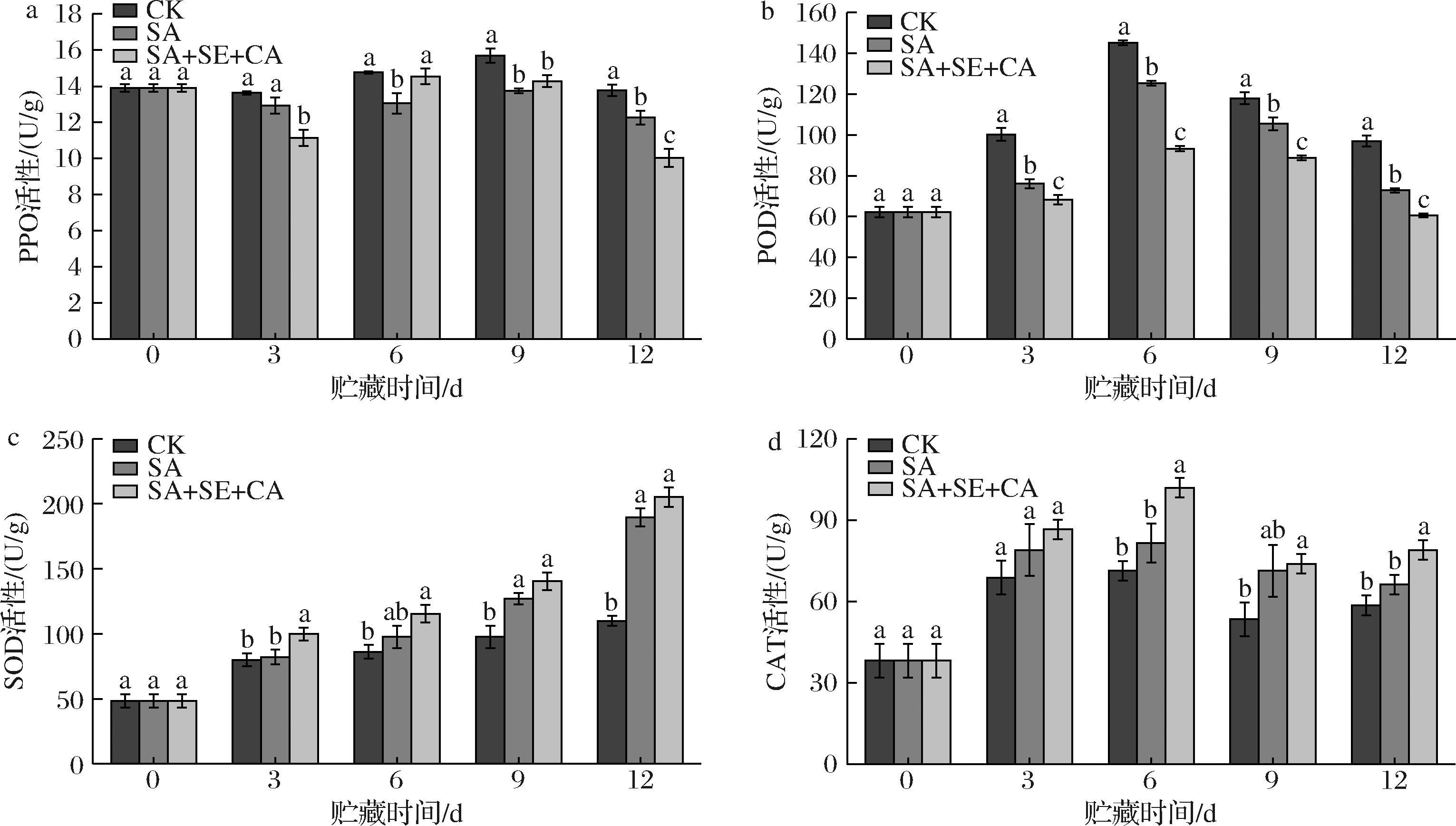 a-PPO活性;b-POD活性;c-SOD活性;d-CAT活性