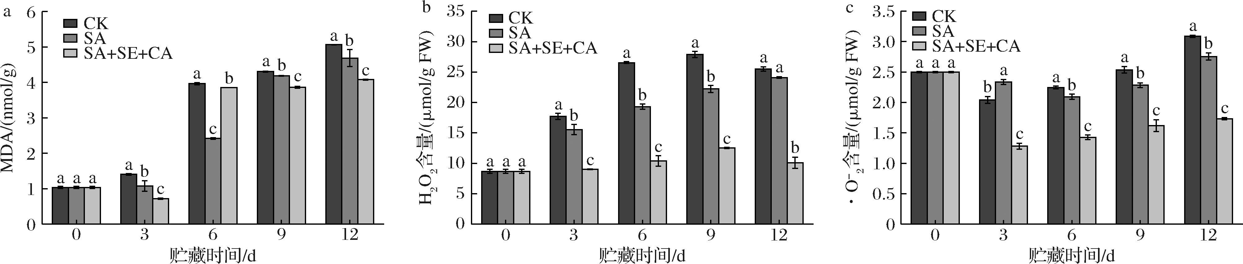 a-MDA含量;b-H2O2含量;c-·O2-含量