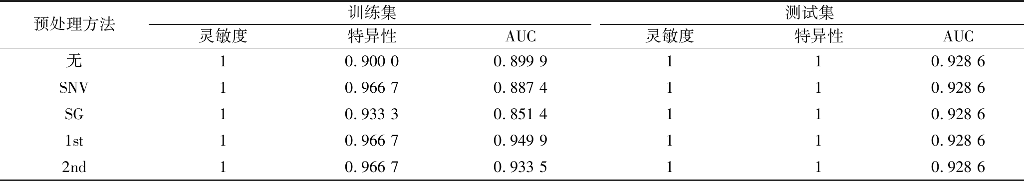 预处理方法训练集测试集灵敏度特异性AUC灵敏度特异性AUC无10.900 00.899 9110.928 6SNV10.966 70.887 4110.928 6SG10.933 30.851 4110.928 61st10.966 70.949 9110.928 62nd10.966 70.933 5110.928 6
