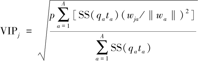 为得分矩阵T的第a列向量;qa为T的回归系数向量q的第a个元素;wa为加权矩阵W的第a列向量,它给出了保留维度中第j个变量的加权变异性;p为回归矩阵X中的变量数量;wja/‖wa‖为第a个分量中第j个变量的重要性;SS(qata)为由第a个分量解释的y方差。