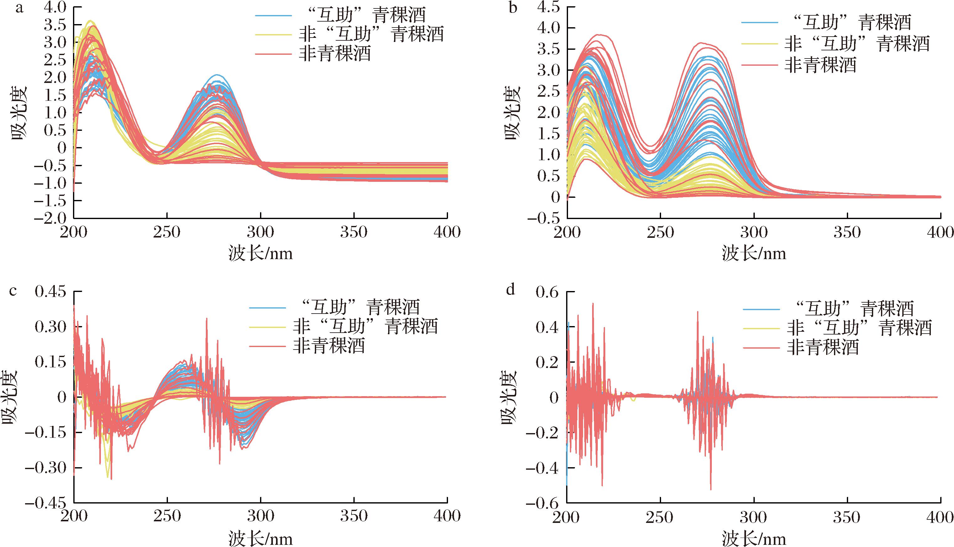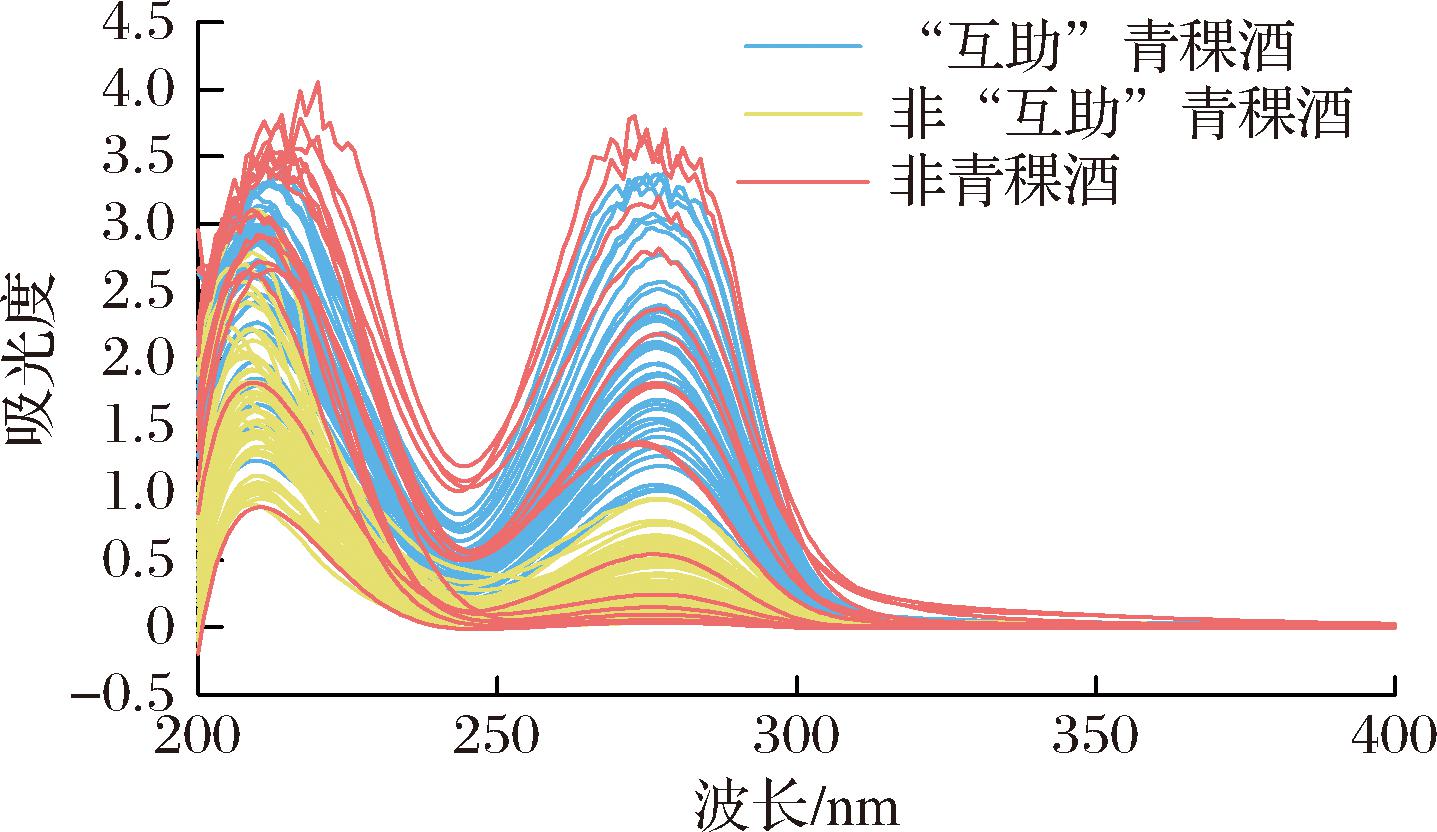 如图1所示,在UV光谱区域内,200~220、260~290 nm出现明显的吸收峰,分别为羧基和糠醛吸收峰。糠醛这类物质在白酒中是重要的呈香成分,其结构中含有1个醛基和1个呋喃环,2个双键和1个环醚键,化学性质活泼。当连续波长的紫外光照射白酒样品时,糠醛中的不饱和键中的电子吸收能量从低能级跃迁到高能级,在276 nm处形成较强的特征吸收峰。白酒中的糠醛主要是由美拉德反应和微生物代谢产生的,不同香型的白酒受酿造原料、地理来源、发酵温度、发酵时间、微生物等因素影响,其糠醛含量必然存在差异[26]。从结果看,“互助”青稞酒和非“互助”青稞酒中糠醛的含量存在明显差异,但无法与非青稞酒区分开,这与白酒的酿造工艺有关,因此仅用UV光谱图是无法区分3种类别的样品,需要寻找一种新的策略来区分3种样品。