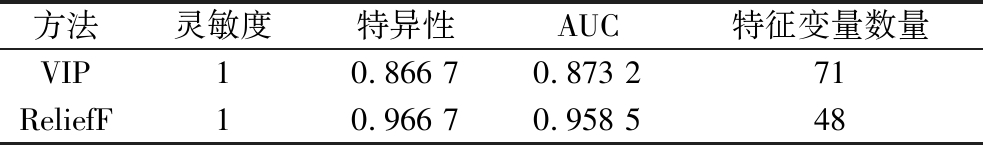 方法灵敏度特异性AUC特征变量数量VIP10.866 70.873 271ReliefF10.966 70.958 548