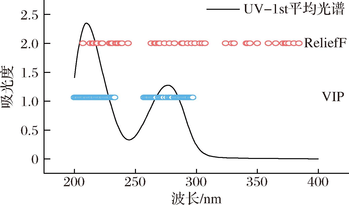 图3标记了对UV-1st光谱分别用VIP和ReliefF筛选的特征波长变量,结果可见,UV-1st光谱中选择的变量集中在230~280 nm。白酒含有大量的酯类、有机酸、醇类和羰基化合物。这些化合物含有发色团,如
