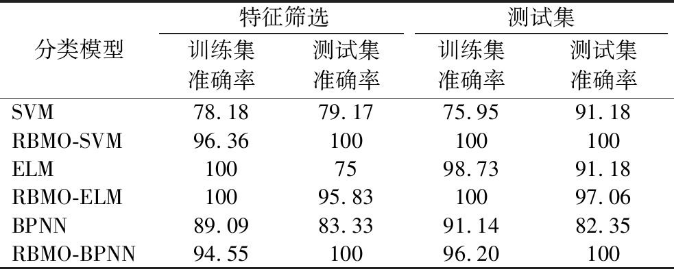 对经过1st-ReliefF结合处理后的数据进行建模。表3是不同分类模型的分类效果。RBMO优化的SVM、ELM、BPNN与传统的SVM、ELM、BPNN相比具有更高的准确率,说明经RBMO优化后的分类模型效果明显比传统的好。