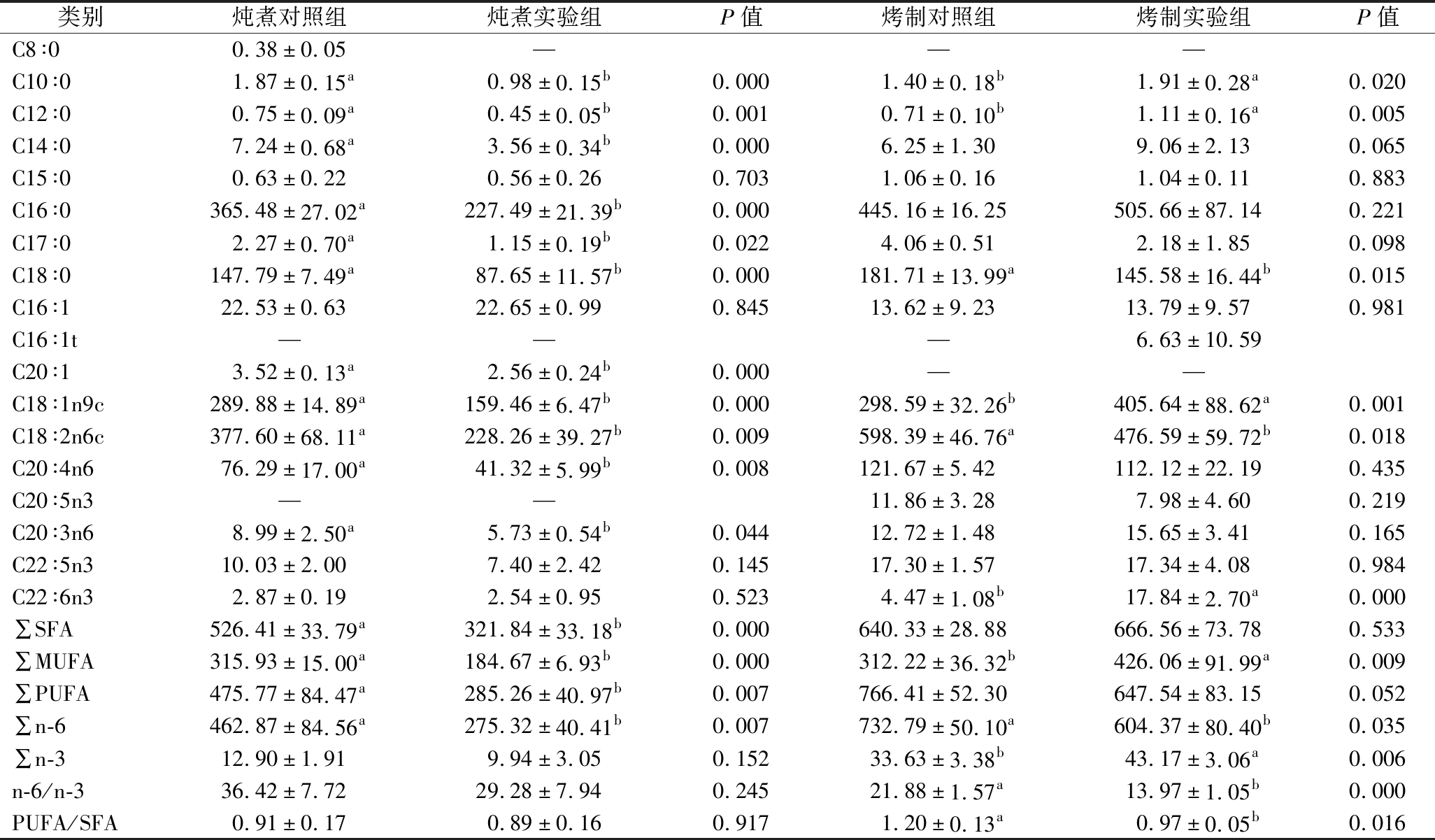 类别炖煮对照组炖煮实验组P值烤制对照组烤制实验组P值C8∶00.38±0.05———C10∶01.87±0.15a0.98±0.15b0.0001.40±0.18b1.91±0.28a0.020C12∶00.75±0.09a0.45±0.05b0.0010.71±0.10b1.11±0.16a0.005C14∶07.24±0.68a3.56±0.34b0.0006.25±1.309.06±2.130.065C15∶00.63±0.220.56±0.260.7031.06±0.161.04±0.110.883C16∶0365.48±27.02a227.49±21.39b0.000445.16±16.25505.66±87.140.221C17∶02.27±0.70a1.15±0.19b0.0224.06±0.512.18±1.850.098C18∶0147.79±7.49a87.65±11.57b0.000181.71±13.99a145.58±16.44b0.015C16∶122.53±0.6322.65±0.990.84513.62±9.2313.79±9.570.981C16∶1t———6.63±10.59C20∶13.52±0.13a2.56±0.24b0.000——C18∶1n9c289.88±14.89a159.46±6.47b0.000298.59±32.26b405.64±88.62a0.001C18∶2n6c377.60±68.11a228.26±39.27b0.009598.39±46.76a476.59±59.72b0.018C20∶4n676.29±17.00a41.32±5.99b0.008121.67±5.42112.12±22.190.435C20∶5n3——11.86±3.287.98±4.600.219C20∶3n68.99±2.50a5.73±0.54b0.04412.72±1.4815.65±3.410.165C22∶5n310.03±2.007.40±2.420.14517.30±1.5717.34±4.080.984C22∶6n32.87±0.192.54±0.950.5234.47±1.08b17.84±2.70a0.000∑SFA526.41±33.79a321.84±33.18b0.000640.33±28.88666.56±73.780.533∑MUFA315.93±15.00a184.67±6.93b0.000312.22±36.32b426.06±91.99a0.009∑PUFA475.77±84.47a285.26±40.97b0.007766.41±52.30647.54±83.150.052∑n-6462.87±84.56a275.32±40.41b0.007732.79±50.10a604.37±80.40b0.035∑n-312.90±1.919.94±3.050.15233.63±3.38b43.17±3.06a0.006n-6/n-336.42±7.7229.28±7.940.24521.88±1.57a13.97±1.05b0.000PUFA/SFA0.91±0.170.89±0.160.9171.20±0.13a0.97±0.05b0.016