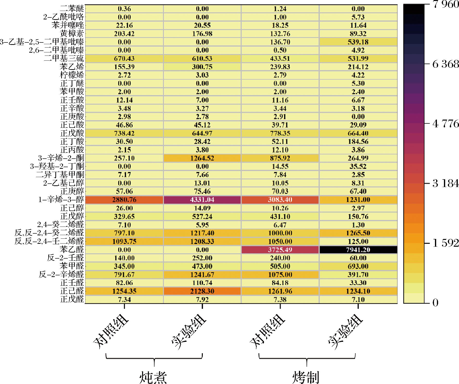 醛类是脂质氧化降解和氨基酸Strecker降解反应产物中最常见的挥发性有机化合物,具有令人愉悦的花香和果香[27],其气味感知阈值低,对肉制品风味有相当大的影响,还可与其他化合物的羰基类物质反应产生其他挥发性物质[28]。对于醛类物质中最主要的正戊醛和正己醛而言,炖煮和烤制处理下2组肉制品间均无显著差异(P>0.05)。目前,正己醛认为主要来源于C18∶2n6c的分解[29],而在FFA含量中,不同加工方式下的不同组别间均存在显著差异,但正己醛含量却并无影响,NATALELLO等[30]也认为正己醛与亚油酸含量间并无关系,因此,本实验结果认为正己醛并非完全依靠亚油酸的分解。在炖煮处理下,实验组肉制品中仅反-2-辛烯醛、苯甲醛、反-2-壬醛和反,反-2,4-癸二烯醛这4种物质浓度显著大于对照组(P<0.05),其他8种醛类物质间均无显著差异,且2组肉制品中总醛类物质浓度间并没有显著差异,这可能是一些脂质和PUFA在加热过程中氧化不一所造成的[31]。在烤制方式下,2组肉制品中总醛类浓度无显著差异,但9种醛类间存在明显差异,其中,实验组肉制品中苯甲醛和苯乙醛浓度显著大于对照组(P<0.05),苯甲醛和苯乙醛是烘烤肉制品中常见的挥发性物质,根据以往研究显示,这2种物质与苯丙氨酸参与的美拉德反应有紧密关系[32],这说明2组肉制品中美拉德反应程度存在差异,同时,对照组中的正壬醛、反-2-辛烯醛、反-2-壬醛、2,6-二甲基苯甲醛、反,反-2,4-壬二烯醛、2-十一烯醛和2,4-癸二烯醛的浓度含量均显著大于实验组(P<0.05)。壬醛是一种仅通过PUFA衍生的脂质过氧化产物,而2组肉制品在FFA中的PUFA含量并无差异,造成这种原因可能是由于壬醛在某些氨基酸影响下通过还原反应生成了一些醇类物质[33],余下的6种醛类物质均来源于脂质热分解和不饱和脂肪酸降解2种反应[34],这说明2组肉制品在烘烤过程中脂质氧化和不饱和脂肪酸降解程度存在差异,进而使得后续一些醛类物质浓度出现差异,同时,烘烤过程中的美拉德反应也是导致各醛类浓度差异的重要原因。