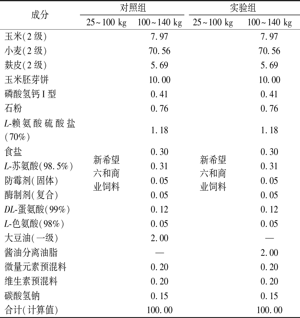 注:对照组为大豆油脂作为育肥油料;实验组为酱油分离油脂作为育肥油料;“—”代表未添加。