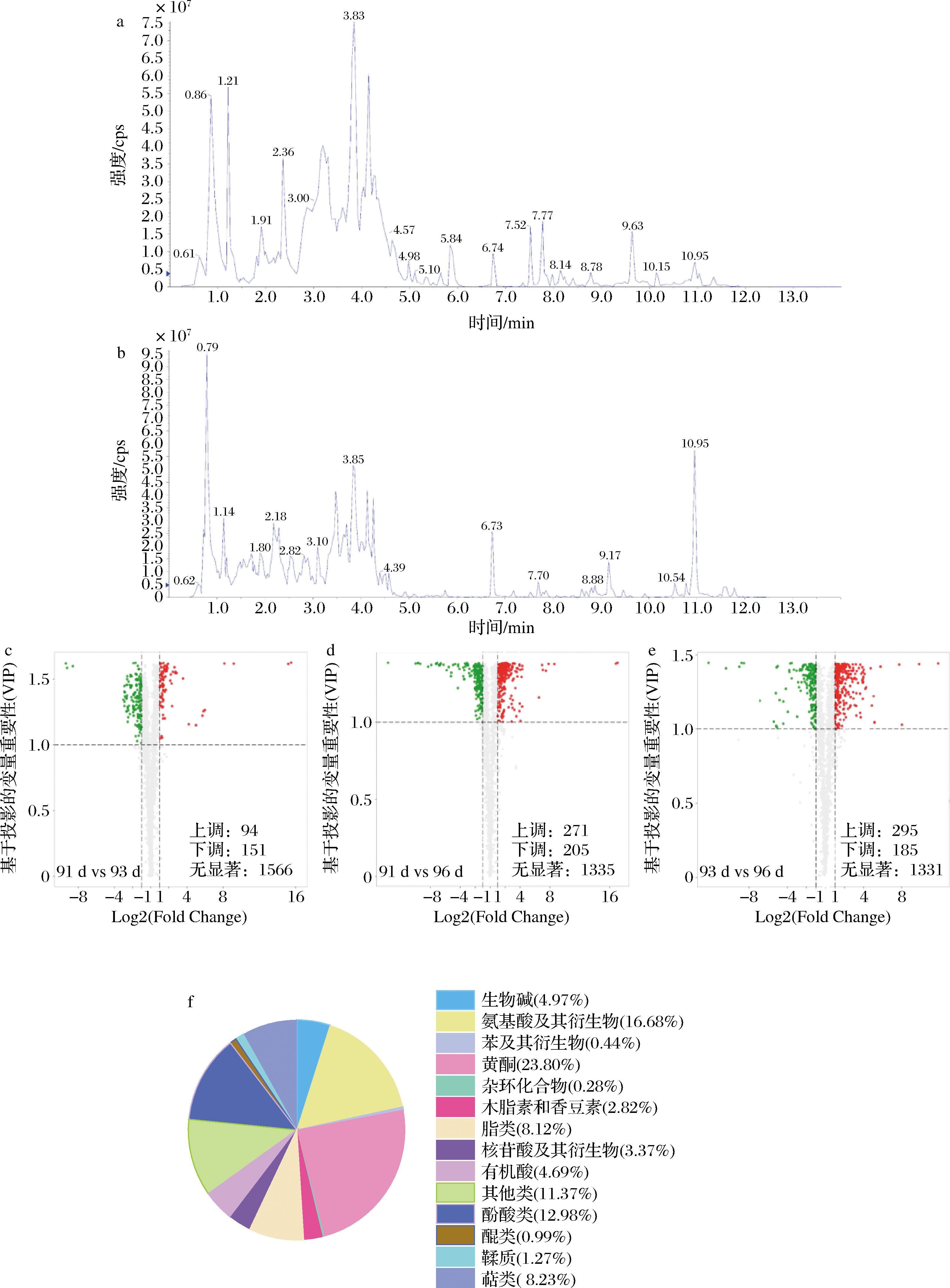 a-正离子流图;b-负离子流图;c-91 d vs 93 d火山图;d-91 d vs 96 d火山图;e-93 d vs 96 d火山图;f-代谢物分类图