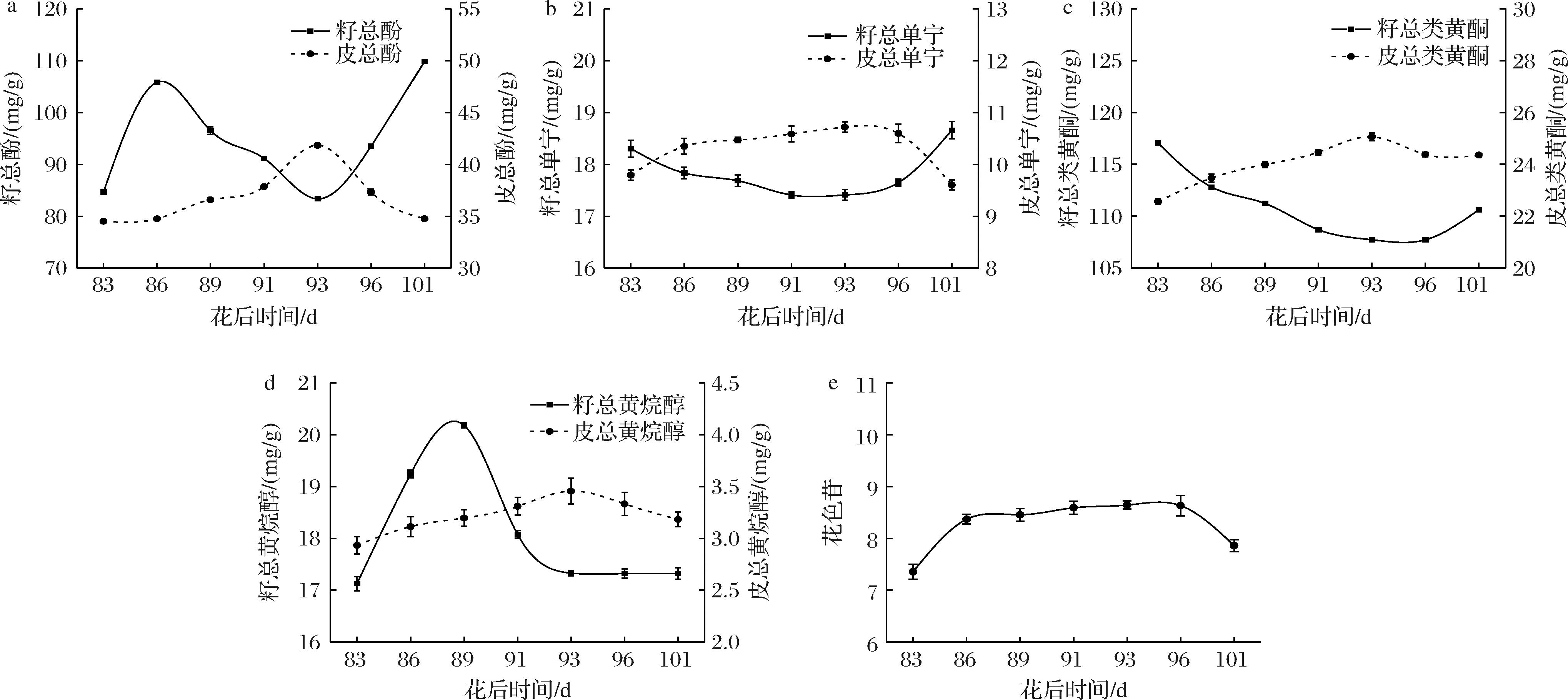 由图2-a可知,果籽中的总酚含量呈持续下降趋势,从花后86 d开始逐渐下降,直至花后93 d达到最低值(85.35 mg/g),然后开始上升,至花后101 d达到109.85 mg/g(P<0.05)。此外,籽中的总类黄酮含量在花后83 d达到最大值(117.04 mg/g),然后开始下降,在花后86~93 d期间保持在112.80~107.71 mg/g(图2-c)。籽中的总黄烷醇含量在花后91 d开始缓慢下降,保持在18.08~17.32 mg/g,变化趋势相对平稳,未出现明显波动(P<0.05)(图2-d)。