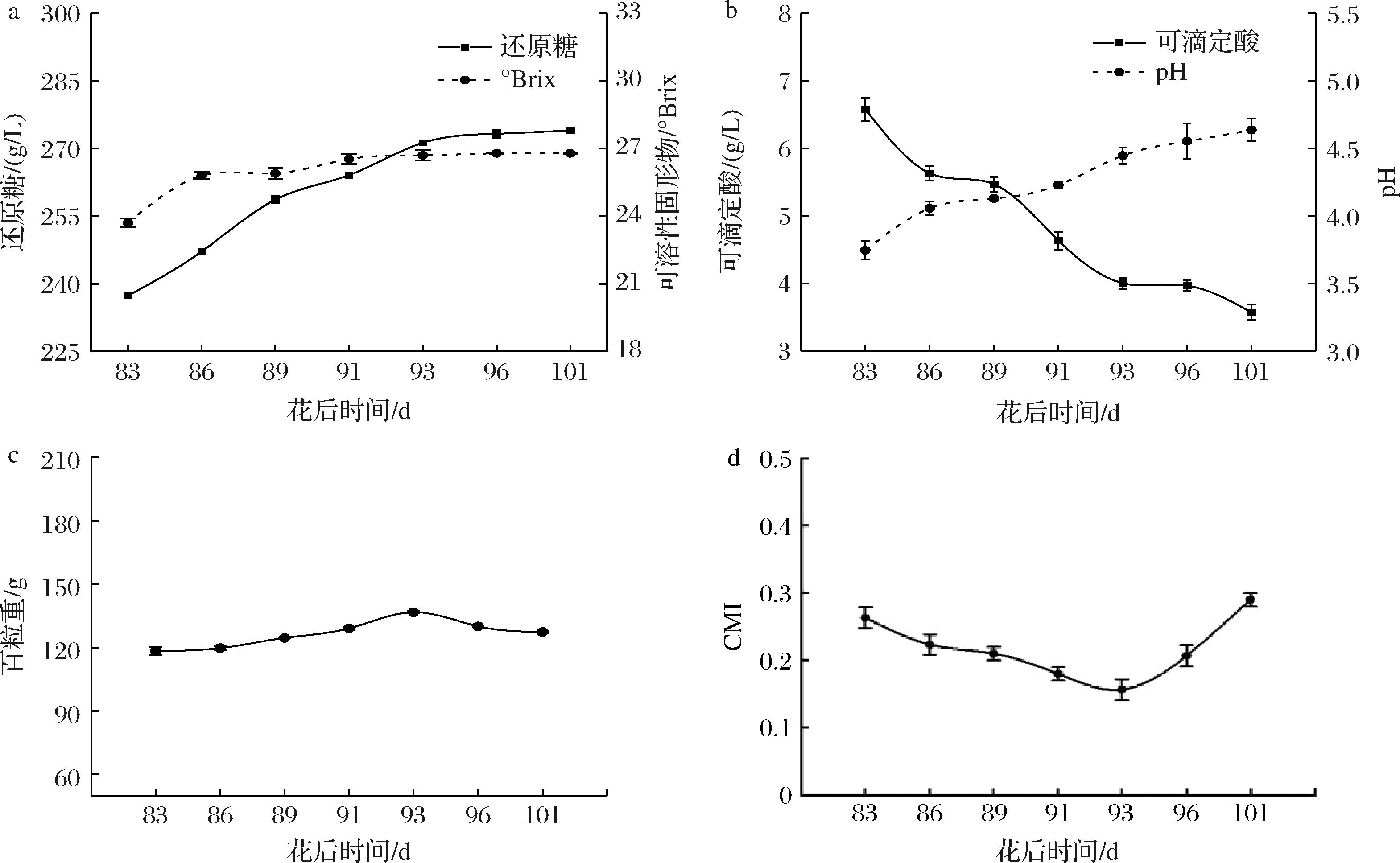 为了研究采收时间对赤霞珠葡萄的影响,本研究在花后83~101 d(2023年8月至10月)进行了连续采样。如图1所示,尽管果实的结构特征变化较小,但其化学成分发生了显著变化。尤其是可溶性固形物和还原糖含量自花后83 d开始逐步积累,且在花后91 d时出现明显的增加(可溶性固形物从23.71°Brix增至26.70°Brix,还原糖从237.37 g/L增至273.27 g/L,P<0.05,图1-a)。与此相对,随着葡萄逐渐成熟,可滴定酸含量从花后83 d起逐步下降(由6.57 g/L降至3.97 g/L,P<0.05),同时pH值从3.75升高至4.55(P<0.05,图1-b),表明葡萄在成熟过程中酸度的减少与糖分积累的同步变化。这些理化指标的变化与果实的百粒重呈现出直接关系。图1-c显示,从花后83~96 d,百粒重从118.33 g增加至130.00 g,增加幅度接近10%(P<0.05),反映了葡萄果实在成熟过程中水分和可溶性固形物的积累,进一步支持了前述的糖分增加变化。此外,细胞成熟度指数(cell maturity index,CMI)作为衡量葡萄成熟度的重要指标,也在不同花后时间表现出变化。通常来说,CMI值反映了在不同酸性条件下花色苷的提取能力,值越小说明葡萄成熟度越高。如图1-d所示,CMI值在花后83~93 d期间呈逐渐下降趋势,从0.26降至0.15,显示出葡萄在此阶段成熟度较高。然后,CMI值在93 d后开始回升,至101 d时增至0.29,这可能与葡萄过熟过程中果皮硬度变化有关,导致花色苷的提取率发生变化[14]。