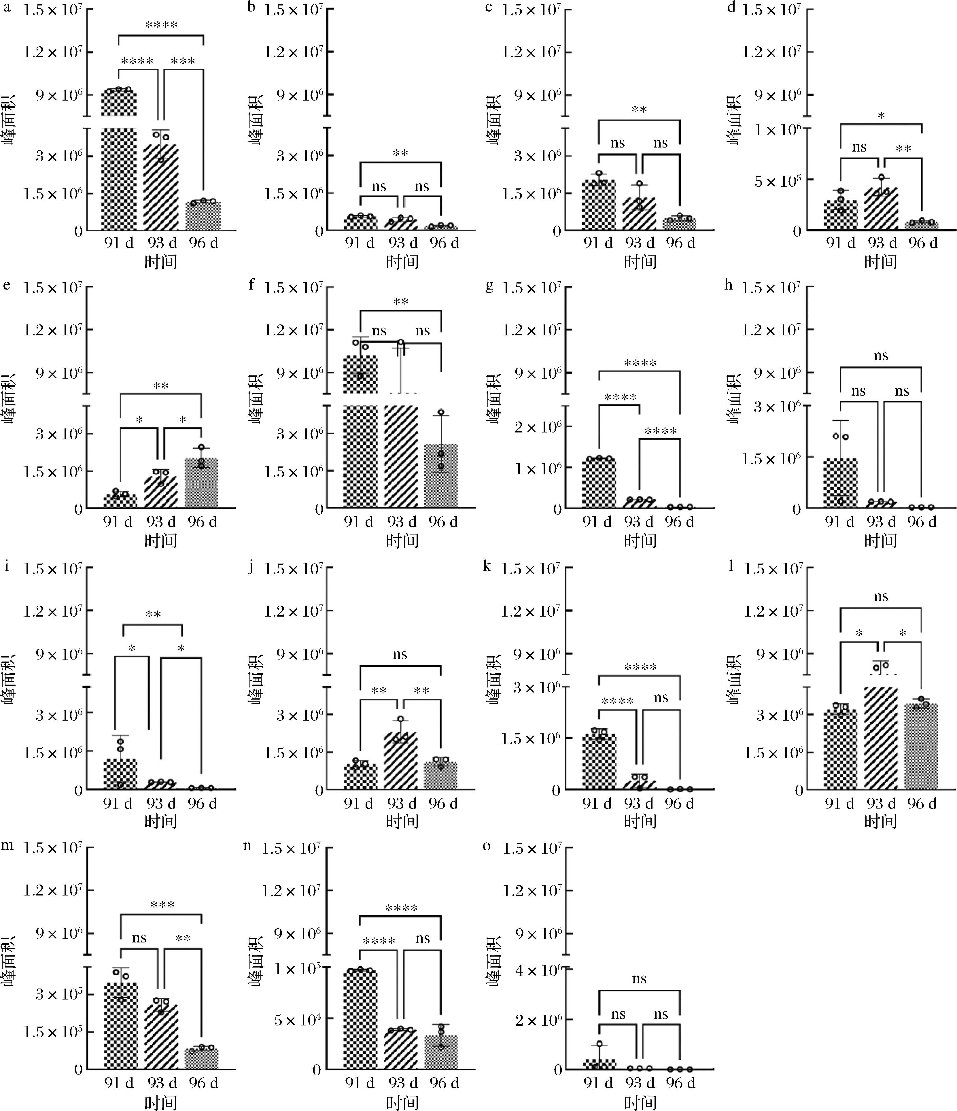 氨基酸种类和含量是反映葡萄酒品质的重要指标,不仅是关键的呈味物质,也是重要的香气前体(如亮氨酸、缬氨酸、异亮氨酸和苯丙氨酸),显著增强葡萄酒的感官特征。本研究分析了3个时间段的葡萄样品,筛选出了L-色氨酸(图4-l)、L-精氨酸(图4-m)、L-亮氨酸(图4-n)等氨基酸及其衍生物(如还原型谷胱甘肽,图4-o)等显著差异的代谢物。其中,L-精氨酸的含量从花后91 d的3.104×105下降至花后96 d的2.5×104,显示出明显的减少趋势。L-色氨酸也表现出类似地下降趋势,从花后93 d的5.28×106增加至花后96 d的3.27×106。L-亮氨酸的含量在花后91 d 为1.02×105,逐渐减少至花后96 d 的1.0×104。这可能与葡萄成熟过程中氨基酸的代谢变化有关[17]。另外,还发现还原型谷胱甘肽的含量在花后93 d时显著波动,尤其在花后96 d,含量从1.5×104降至3.19×103,达到最低值。这一变化将对葡萄成熟过程中抗氧化能力造成影响[18]。