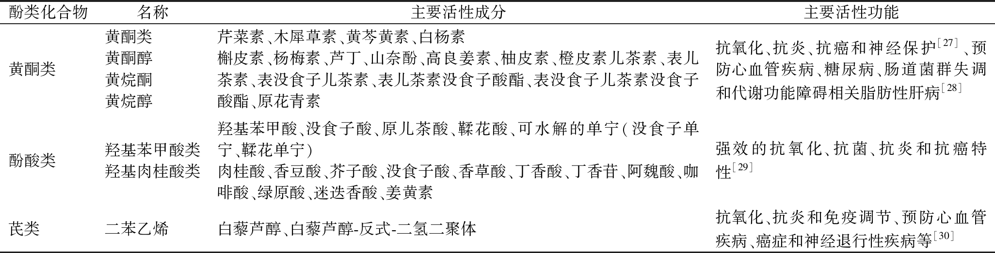 酚类化合物名称主要活性成分主要活性功能黄酮类黄酮类黄酮醇黄烷酮黄烷醇芹菜素、木犀草素、黄芩黄素、白杨素槲皮素、杨梅素、芦丁、山奈酚、高良姜素、柚皮素、橙皮素儿茶素、表儿茶素、表没食子儿茶素、表儿茶素没食子酸酯、表没食子儿茶素没食子酸酯、原花青素抗氧化、抗炎、抗癌和神经保护[27]、预防心血管疾病、糖尿病、肠道菌群失调和代谢功能障碍相关脂肪性肝病[28]酚酸类羟基苯甲酸类羟基肉桂酸类羟基苯甲酸、没食子酸、原儿茶酸、鞣花酸、可水解的单宁(没食子单宁、鞣花单宁)肉桂酸、香豆酸、芥子酸、没食子酸、香草酸、丁香酸、丁香苷、阿魏酸、咖啡酸、绿原酸、迷迭香酸、姜黄素强效的抗氧化、抗菌、抗炎和抗癌特性[29]芪类二苯乙烯白藜芦醇、白藜芦醇-反式-二氢二聚体抗氧化、抗炎和免疫调节、预防心血管疾病、癌症和神经退行性疾病等[30]