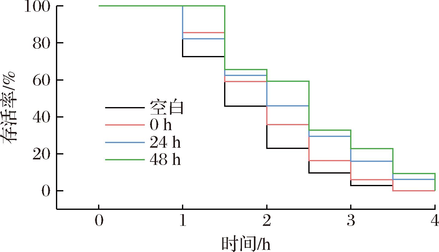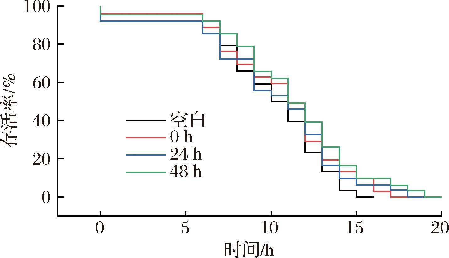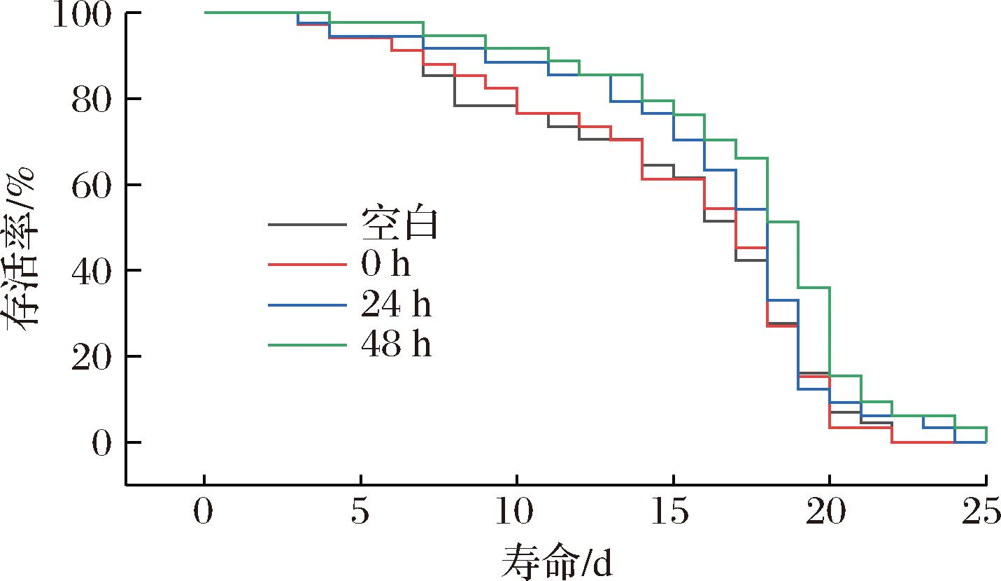 线虫寿命测定:参考PATANANAN等[17]的方法并略作修改。取1 mg/mL不同发酵时间(0、24、48 h)的样品溶液,以体积比1∶10与大肠杆菌OP50菌液加到NGM培养基中,涂布均匀,挑取L4期线虫于不同培养基中,每组30条、3个平行,20 ℃下恒温培养;每隔24 h使用取虫器末端轻轻触碰线虫头部,在体视显微镜下观察,若线虫虫体在多次触碰后均无反应则视为死亡,记录存活线虫数量,并将存活线虫转移至新的食物盘中,重复上述操作,直至盘中线虫全部死亡。寿命测定重复3次,以平均值绘制线虫寿命曲线。空白组为纯大肠杆菌OP50培养液。