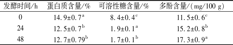 发酵时间/h蛋白质含量/%可溶性糖含量/%多酚含量/(mg/100 g)014.9±0.7a8.4±0.4c11.5±0.6c2412.5±0.7b1.9±0.1a15.2±0.8b4812.7±0.79b1.7±0.1b17.3±0.9a